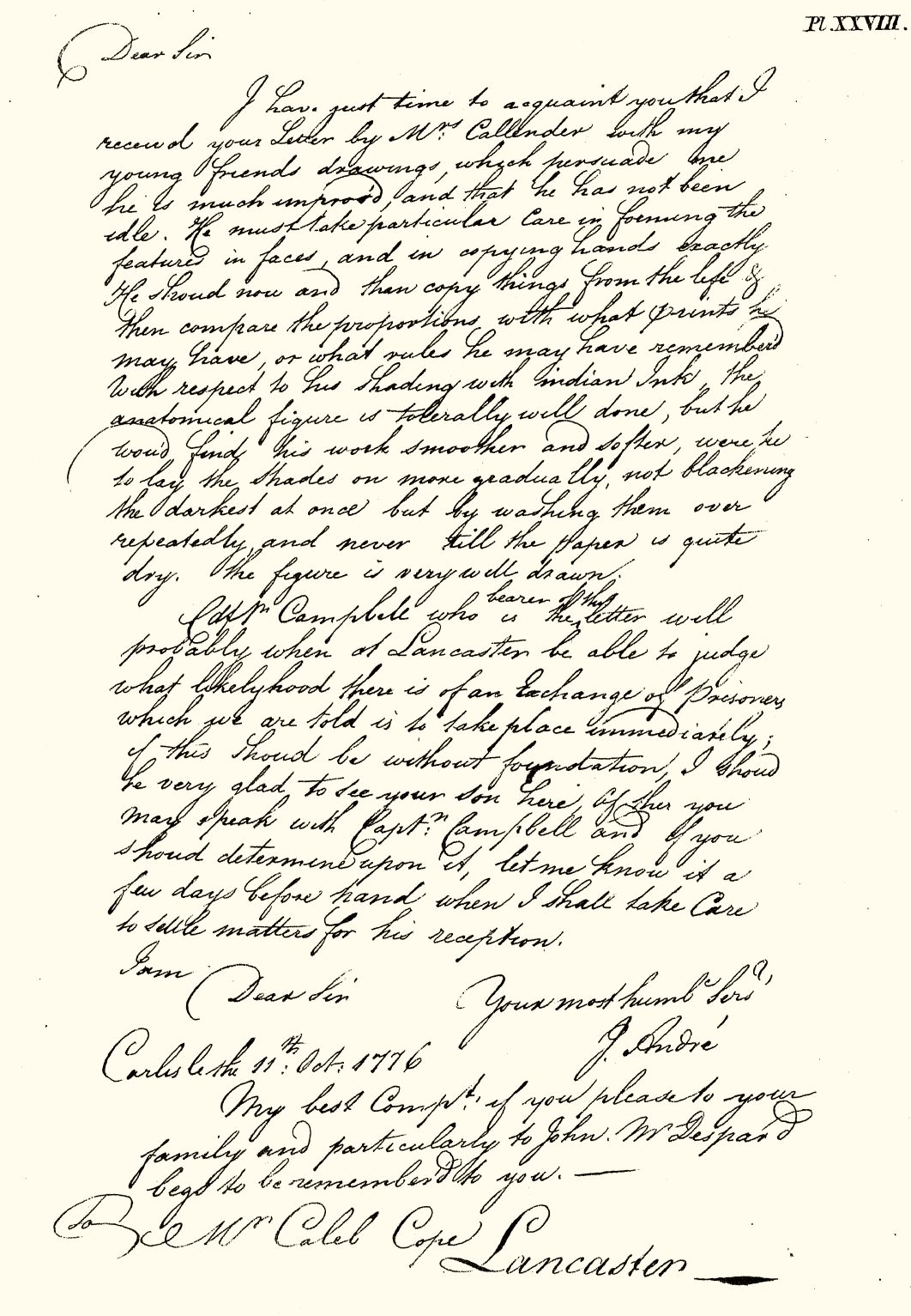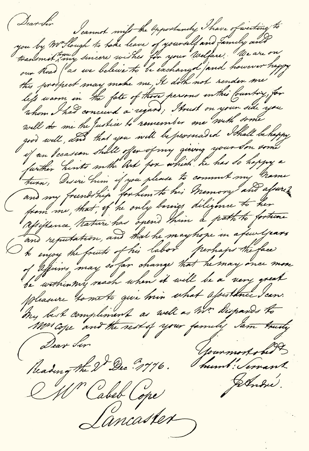 Among the children of Andre's benevolent host, there was one named John, then aged about thirteen years, in whom the former felt deeply interested. He had displayed a remarkable talent for drawing, as the letters of Andre show. This boy was the brother of Thomas P. Cope, Israel Cope, and Jasper Cope, and the father of Herman Cope, in whose possession the following letters and picture now are. All the brothers (including a fourth one named William) were then living under the same roof with Andre, and the elder ones were frequently entertained by him in games of marbles and other youthful sports.