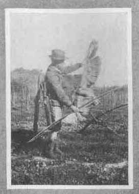 In the afternoon he discovered a large old bull lying down in a burnt-over area, where approach by stealth was possible, so he began his stalk with utmost caution, paying particular attention to scent and sound. By crawling on his hands and knees he came within a hundred and fifty yards, when his progress was stopped by a fallen tree. To go around it, would expose him to vision; to climb over, would alarm the animal by snapping twigs; so Young decided to dig under. He worked with his hunting knife and hands for one hour to accomplish this operation. When he had passed this obstacle he continued his crawling till he reached a distance of sixty yards. At this stage Art called the old bull with a birch bark horn, then the moose heard him and stood up. The brush was so thick that he could not shoot immediately, but waited as the old bull circled to catch his wind and answered the challenge. When he presented a fair target at seventy yards or so, Art drove an arrow at him. It struck deep in the flank, up to the feather ranging forward. The bull was only startled a trifle and trotted off a hundred yards. Here he stopped to look and listen. Young drew his bow again, and overshooting his mark, his arrow struck one of the broad thick palms of the antlers. The point pierced the two inches of bone and wedged tight, making a sharp report as it hit. This started the animal off at a fast trot. Young followed slowly at some distance and soon had the satisfaction of seeing the moose waver in his course and lie down. After a reasonable wait the hunter advanced to his quarry and found him dead. The triumph of such an episode is more or less mixed with misery. The pleasure undoubtedly would have been greater had some other lusty bow man been with him, but as it was he had to feast his eyes alone, moreover he had to make his way back to camp, which was some eight miles off, and night rapidly coming on.