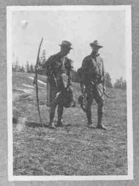 Equipped with cameras, camp outfit and archery tackle, they sailed for Seward. From here they ventured into the wilderness as circumstances directed. Sometimes they went by boat to Kadiac Island, sometimes to the Kenai Peninsula, or they journeyed by dog sleds and packs inland. They spent the better part of two years in this hard, exacting work, often carrying as much as a hundred pounds on their backs for many miles. Great credit must be given to Art's partner Jack Robertson, for his energy, bravery and fortitude. His work with the camera will make history, but for the time being we shall focus our attention on the man with the bow. Only a small portion of Young's time was devoted to hunting, the exigencies incidental to travel and gathering animal pictures were such that archery was of secondary importance.