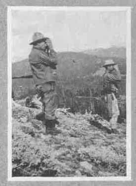 Taking this mental attitude into consideration, Young decided that the best method of outwitting this particular sheep was to take him at his own valuation and proceed as a tenderfoot down the valley. So he walked unconcernedly along at an oblique angle to the sheep and never once taking a direct look at him. He went gaily along whistling, kicking pebbles and swinging his bow. When he had reached a distance of two or three hundred yards the old sheep lifted up his head to see what was going on. Young paid no attention to him, though he observed him out of the corner of his eyes. So the wise old boy settled back content with his diagnosis.