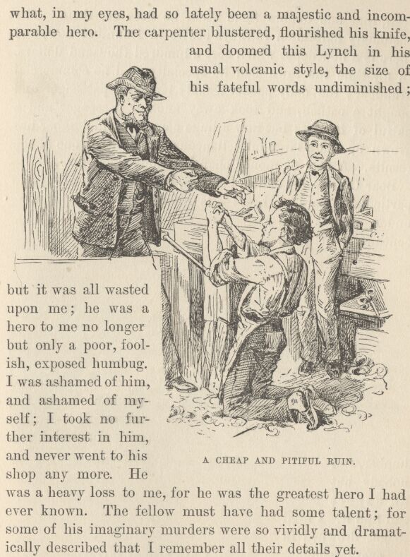 The carpenter blustered, flourished his knife, and doomed this Lynch in his usual volcanic style, the size of his fateful words undiminished; but it was all wasted upon me; he was a hero to me no longer, but only a poor, foolish, exposed humbug. I was ashamed of him, and ashamed of myself; I took no further interest in him, and never went to his shop any more. He was a heavy loss to me, for he was the greatest hero I had ever known. The fellow must have had some talent; for some of his imaginary murders were so vividly and dramatically described that I remember all their details yet.