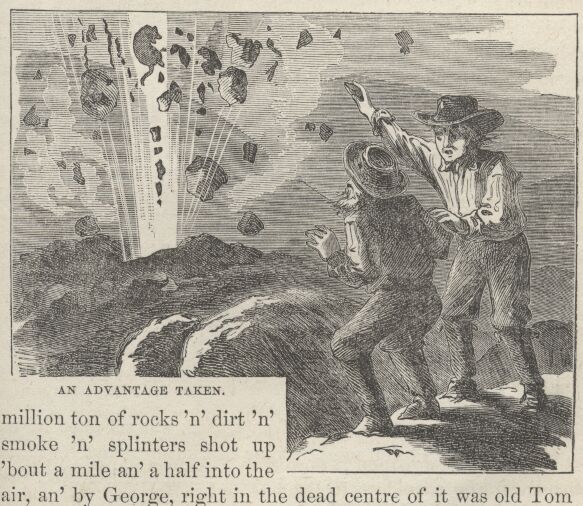 "In 'bout a minute we seen a puff of smoke bust up out of the hole, 'n' then everything let go with an awful crash, 'n' about four million ton of rocks 'n' dirt 'n' smoke 'n; splinters shot up 'bout a mile an' a half into the air, an' by George, right in the dead centre of it was old Tom Quartz a goin' end over end, an' a snortin' an' a sneez'n', an' a clawin' an' a reachin' for things like all possessed. But it warn't no use, you know, it warn't no use. An' that was the last we see of him for about two minutes 'n' a half, an' then all of a sudden it begin to rain rocks and rubbage, an' directly he come down ker-whop about ten foot off f'm where we stood Well, I reckon he was p'raps the orneriest lookin' beast you ever see. One ear was sot back on his neck, 'n' his tail was stove up, 'n' his eye-winkers was swinged off, 'n' he was all blacked up with powder an' smoke, an' all sloppy with mud 'n' slush f'm one end to the other.