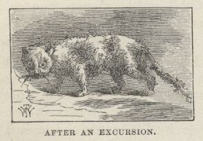 "Well, bye an' bye, up comes this yer quartz excitement. Every body was into it—every body was pick'n' 'n' blast'n' instead of shovelin' dirt on the hill side—every body was put'n' down a shaft instead of scrapin' the surface. Noth'n' would do Jim, but we must tackle the ledges, too, 'n' so we did. We commenced put'n' down a shaft, 'n' Tom Quartz he begin to wonder what in the Dickens it was all about. He hadn't ever seen any mining like that before, 'n' he was all upset, as you may say—he couldn't come to a right understanding of it no way—it was too many for him. He was down on it, too, you bet you—he was down on it powerful—'n' always appeared to consider it the cussedest foolishness out. But that cat, you know, was always agin new fangled arrangements—somehow he never could abide'em. You know how it is with old habits. But by an' by Tom Quartz begin to git sort of reconciled a little, though he never could altogether understand that eternal sinkin' of a shaft an' never pannin' out any thing. At last he got to comin' down in the shaft, hisself, to try to cipher it out. An' when he'd git the blues, 'n' feel kind o'scruffy, 'n' aggravated 'n' disgusted—knowin' as he did, that the bills was runnin' up all the time an' we warn't makin' a cent—he would curl up on a gunny sack in the corner an' go to sleep. Well, one day when the shaft was down about eight foot, the rock got so hard that we had to put in a blast—the first blast'n' we'd ever done since Tom Quartz was born. An' then we lit the fuse 'n' clumb out 'n' got off 'bout fifty yards—'n' forgot 'n' left Tom Quartz sound asleep on the gunny sack.