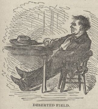 The Admiral seldom read newspapers; and when he did he never believed anything they said. He read nothing, and believed in nothing, but "The Old Guard," a secession periodical published in New York. He carried a dozen copies of it with him, always, and referred to them for all required information. If it was not there, he supplied it himself, out of a bountiful fancy, inventing history, names, dates, and every thing else necessary to make his point good in an argument. Consequently he was a formidable antagonist in a dispute. Whenever he swung clear of the record and began to create history, the enemy was helpless and had to surrender. Indeed, the enemy could not keep from betraying some little spark of indignation at his manufactured history—and when it came to indignation, that was the Admiral's very "best hold." He was always ready for a political argument, and if nobody started one he would do it himself. With his third retort his temper would begin to rise, and within five minutes he would be blowing a gale, and within fifteen his smoking-room audience would be utterly stormed away and the old man left solitary and alone, banging the table with his fist, kicking the chairs, and roaring a hurricane of profanity. It got so, after a while, that whenever the Admiral approached, with politics in his eye, the passengers would drop out with quiet accord, afraid to meet him; and he would camp on a deserted field.