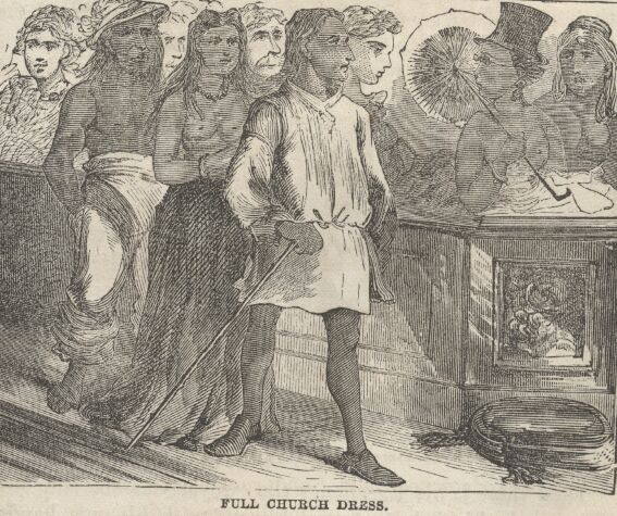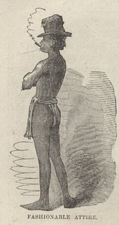 The natives soon manifested a strong proclivity for clothing, but it was shortly apparent that they only wanted it for grandeur. The missionaries imported a quantity of hats, bonnets, and other male and female wearing apparel, instituted a general distribution, and begged the people not to come to church naked, next Sunday, as usual. And they did not; but the national spirit of unselfishness led them to divide up with neighbors who were not at the distribution, and next Sabbath the poor preachers could hardly keep countenance before their vast congregations. In the midst of the reading of a hymn a brown, stately dame would sweep up the aisle with a world of airs, with nothing in the world on but a "stovepipe" hat and a pair of cheap gloves; another dame would follow, tricked out in a man's shirt, and nothing else; another one would enter with a flourish, with simply the sleeves of a bright calico dress tied around her waist and the rest of the garment dragging behind like a peacock's tail off duty; a stately "buck" Kanaka would stalk in with a woman's bonnet on, wrong side before—only this, and nothing more; after him would stride his fellow, with the legs of a pair of pantaloons tied around his neck, the rest of his person untrammeled; in his rear would come another gentleman simply gotten up in a fiery neck-tie and a striped vest.