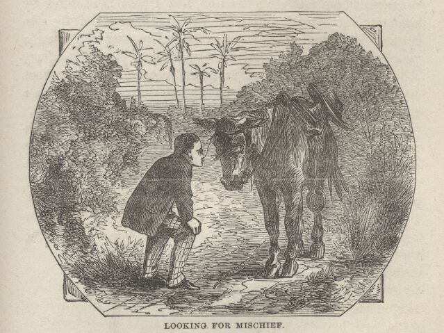 I cannot describe what a load of anxiety was lifted from my mind when I found that he was only asleep. I woke him up and started him into a faster walk, and then the villainy of his nature came out again. He tried to climb over a stone wall, five or six feet high. I saw that I must apply force to this horse, and that I might as well begin first as last. I plucked a stout switch from a tamarind tree, and the moment he saw it, he surrendered. He broke into a convulsive sort of a canter, which had three short steps in it and one long one, and reminded me alternately of the clattering shake of the great earthquake, and the sweeping plunging of the Ajax in a storm.