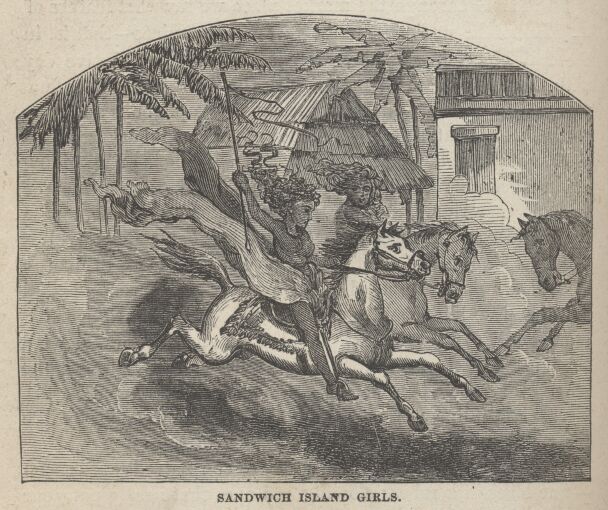 Passing through the market place we saw that feature of Honolulu under its most favorable auspices—that is, in the full glory of Saturday afternoon, which is a festive day with the natives. The native girls by twos and threes and parties of a dozen, and sometimes in whole platoons and companies, went cantering up and down the neighboring streets astride of fleet but homely horses, and with their gaudy riding habits streaming like banners behind them. Such a troop of free and easy riders, in their natural home, the saddle, makes a gay and graceful spectacle. The riding habit I speak of is simply a long, broad scarf, like a tavern table cloth brilliantly colored, wrapped around the loins once, then apparently passed between the limbs and each end thrown backward over the same, and floating and flapping behind on both sides beyond the horse's tail like a couple of fancy flags; then, slipping the stirrup-irons between her toes, the girl throws her chest forward, sits up like a Major General and goes sweeping by like the wind.
