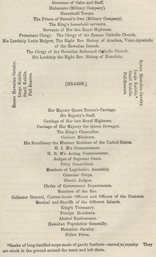 Undertaker. Royal School. Kawaiahao School. Roman Catholic School. Maemae School. Honolulu Fire Department. Mechanics' Benefit Union. Attending Physicians. Knonohikis (Superintendents) of the Crown Lands, Konohikis of the Private Lands of His Majesty Konohikis of the Private Lands of Her late Royal Highness. Governor of Oahu and Staff. Hulumanu (Military Company). Household Troops. The Prince of Hawaii's Own (Military Company). The King's household servants. Servants of Her late Royal Highness. Protestant Clergy. The Clergy of the Roman Catholic Church. His Lordship Louis Maigret, The Right Rev. Bishop of Arathea, Vicar- Apostolic of the Hawaiian Islands. The Clergy of the Hawaiian Reformed Catholic Church. His Lordship the Right Rev. Bishop of Honolulu. Her Majesty Queen Emma's Carriage. His Majesty's Staff. Carriage of Her late Royal Highness. Carriage of Her Majesty the Queen Dowager. The King's Chancellor. Cabinet Ministers. His Excellency the Minister Resident of the United States. H. B. M's Commissioner. H. B. M's Acting Commissioner. Judges of Supreme Court. Privy Councillors. Members of Legislative Assembly. Consular Corps. Circuit Judges. Clerks of Government Departments. Members of the Bar. Collector General, Custom-house Officers and Officers of the Customs. Marshal and Sheriffs of the different Islands. King's Yeomanry. Foreign Residents. Ahahui Kaahumanu. Hawaiian Population Generally. Hawaiian Cavalry. Police Force.