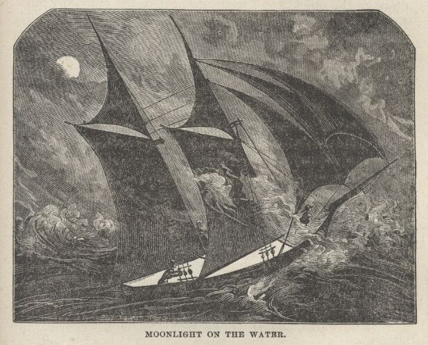 It was compensation for my sufferings to come unexpectedly upon so beautiful a scene as met my eye—to step suddenly out of the sepulchral gloom of the cabin and stand under the strong light of the moon—in the centre, as it were, of a glittering sea of liquid silver—to see the broad sails straining in the gale, the ship heeled over on her side, the angry foam hissing past her lee bulwarks, and sparkling sheets of spray dashing high over her bows and raining upon her decks; to brace myself and hang fast to the first object that presented itself, with hat jammed down and coat tails whipping in the breeze, and feel that exhilaration that thrills in one's hair and quivers down his back bone when he knows that every inch of canvas is drawing and the vessel cleaving through the waves at her utmost speed. There was no darkness, no dimness, no obscurity there. All was brightness, every object was vividly defined. Every prostrate Kanaka; every coil of rope; every calabash of poi; every puppy; every seam in the flooring; every bolthead; every object; however minute, showed sharp and distinct in its every outline; and the shadow of the broad mainsail lay black as a pall upon the deck, leaving Billings's white upturned face glorified and his body in a total eclipse.