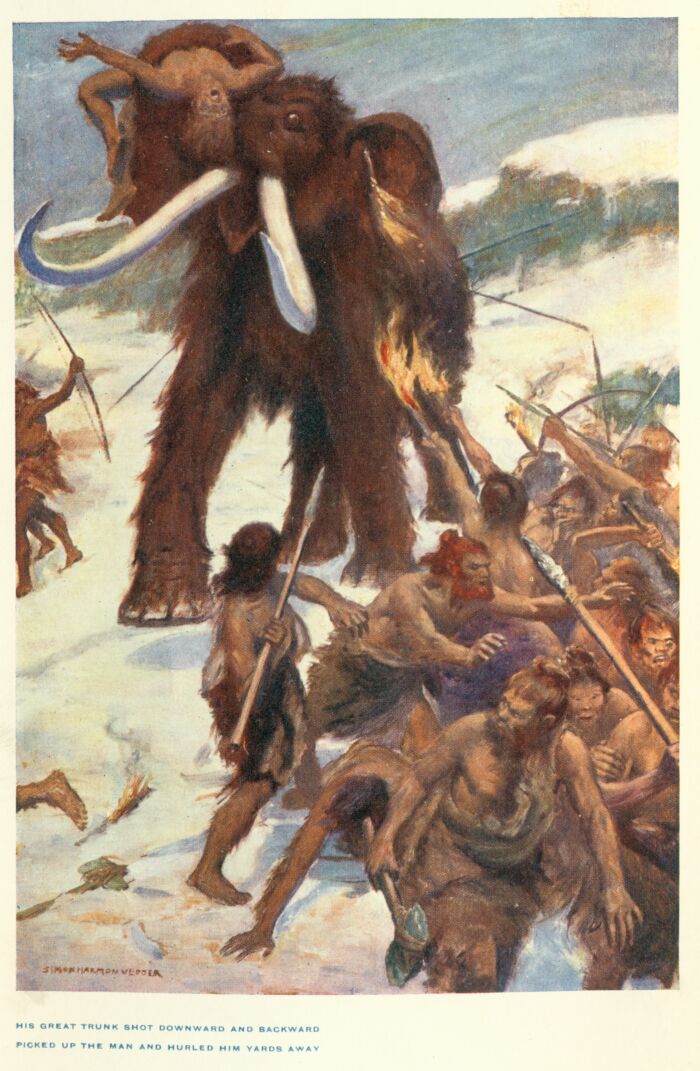 The little group of Fire Valley folk entered the village and were received with shouts from the men, while from the throats of the women still rose the death wail. There were more people about the huts than Ab had ever seen there and he recognized at once among the group many of the cave men from the East, strong people of his own kind. As the wounded runner had gone to the Fire Valley, so another had been sent to the East, to call upon another group for aid, and the Eastern cave people, under the leadership of a huge, swarthy man called Boarface, had come to learn what the strait was and to decide upon what degree of help they could afford to give. Between these Eastern and the Western cave men there was a certain coldness. There was no open enmity, though at some time in the past there had been family battles and memories of feuds were still existent. But Ab and Boarface met genially and there was not a trace of difference now. Boarface joined readily in the council which was held and decided that he would aid in the desperate hunt, and certainly his aid was not to be despised when his followers were looked upon. They were a stalwart lot.