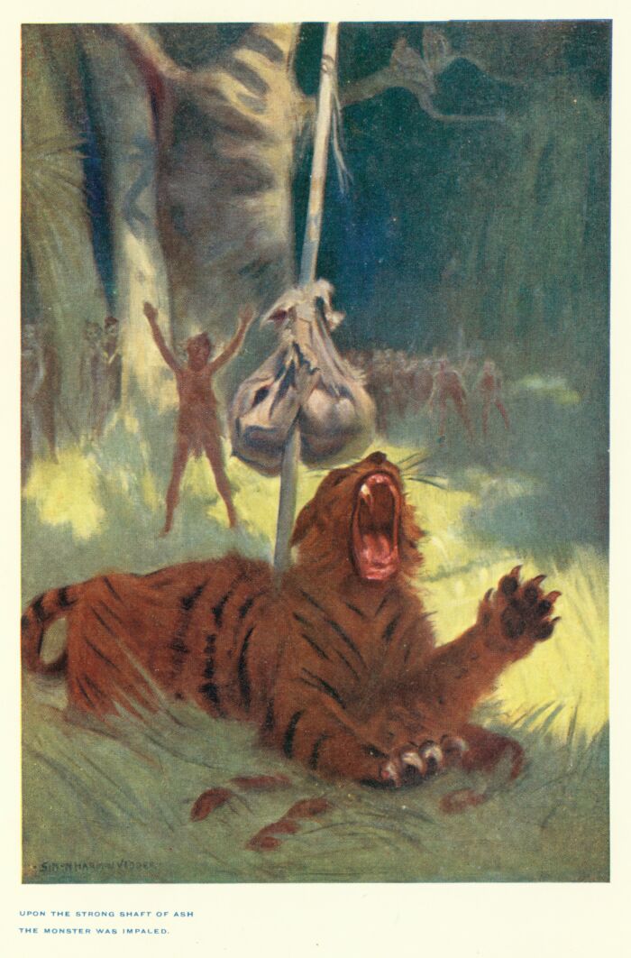 There was bustling in the valley and soon a stalwart dozen men were armed with bow and spear and the journey was taken up toward the Shell Men's home. The village was reached at mid-day and as the little troop emerged from the forest the death wail fell upon their ears. "The tiger has come again!" exclaimed the runner.
