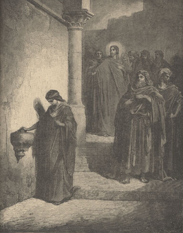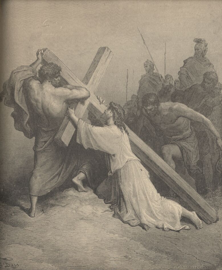 The incident depicted in this illustration seems to be as apocryphal as that embodied in the artist's picture of Mary Magdalene. There is absolutely no warrant in scripture for the notion that Christ fainted under the burden of the cross. The only foundation for such an idea to found in the Bible is contained in the head note to Mark xv, which is quite unwarranted by the text. According to the three synoptic gospels the cross was borne not by Christ, but by Simon, a Cyrenian (see Matthew xxvii, 32; Mark xv, 2 1; Luke xxiii, 26). According to the fourth evangelist, Jesus bore the cross without assistance the whole distance to the place crucifixion (John xix, 16-18). In not one of the four narratives is there so much as a hint that he fainted under the burden.