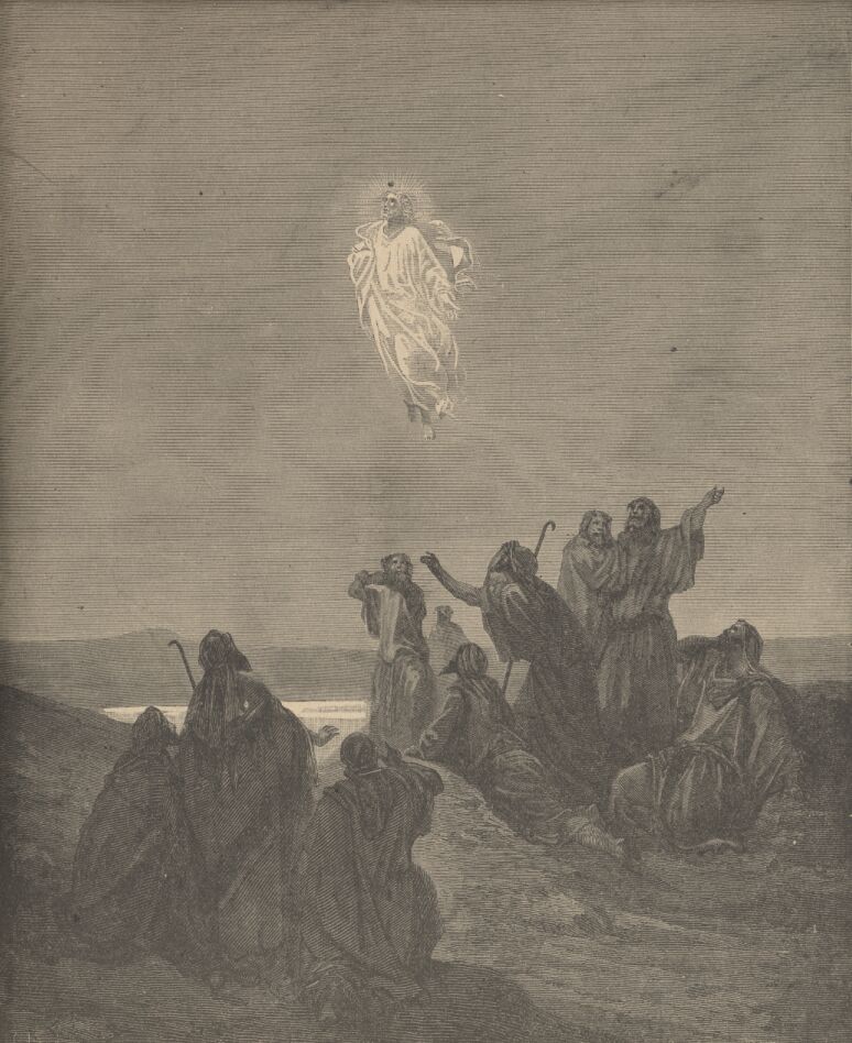 And when he had spoken these things, while they beheld, he was taken up: and a cloud received him out of their sight. And while they looked steadfastly toward heaven as he went up, behold, two men stood by them in white apparel.—Acts i, 1-10