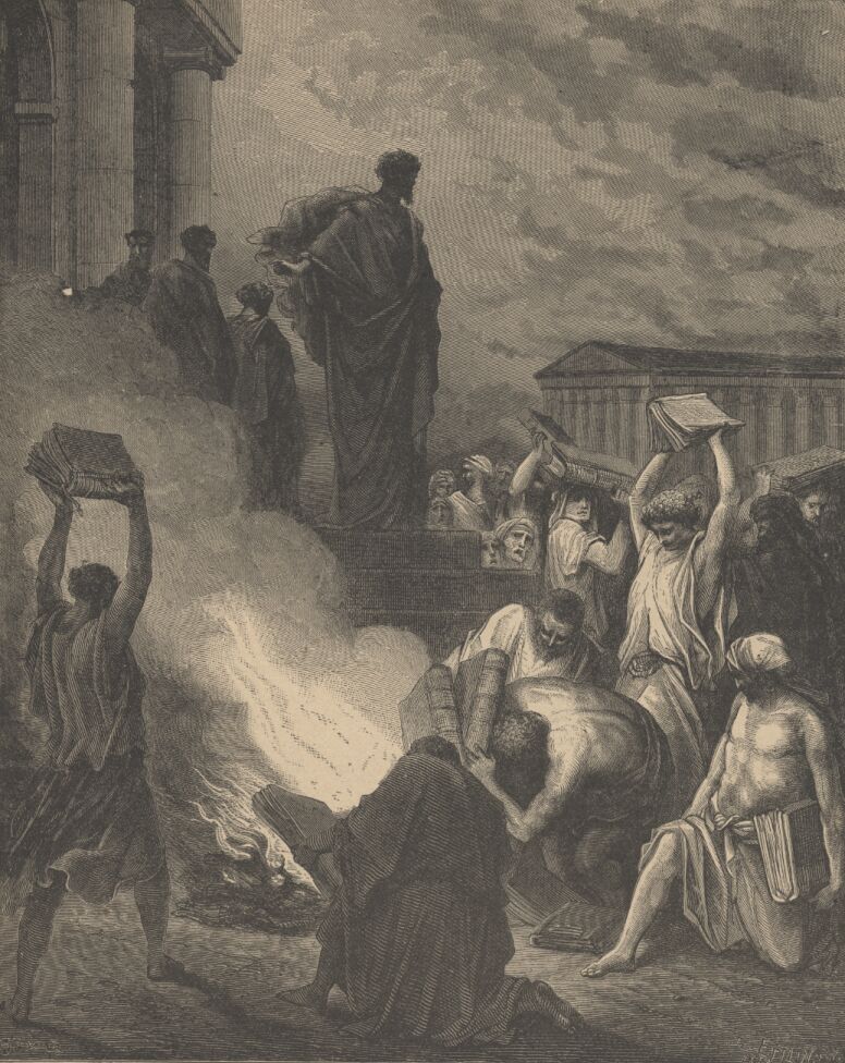 And this was known to all the Jews and Greeks also dwelling at Ephesus; and fear fell on them all, and the name of the Lord Jesus was magnified. And many that believed came, and confessed, and shewed their deeds. Many of them also which used curious arts brought their books together, and burned them before all men: and they counted the price of them, and found it fifty thousand pieces of silver.