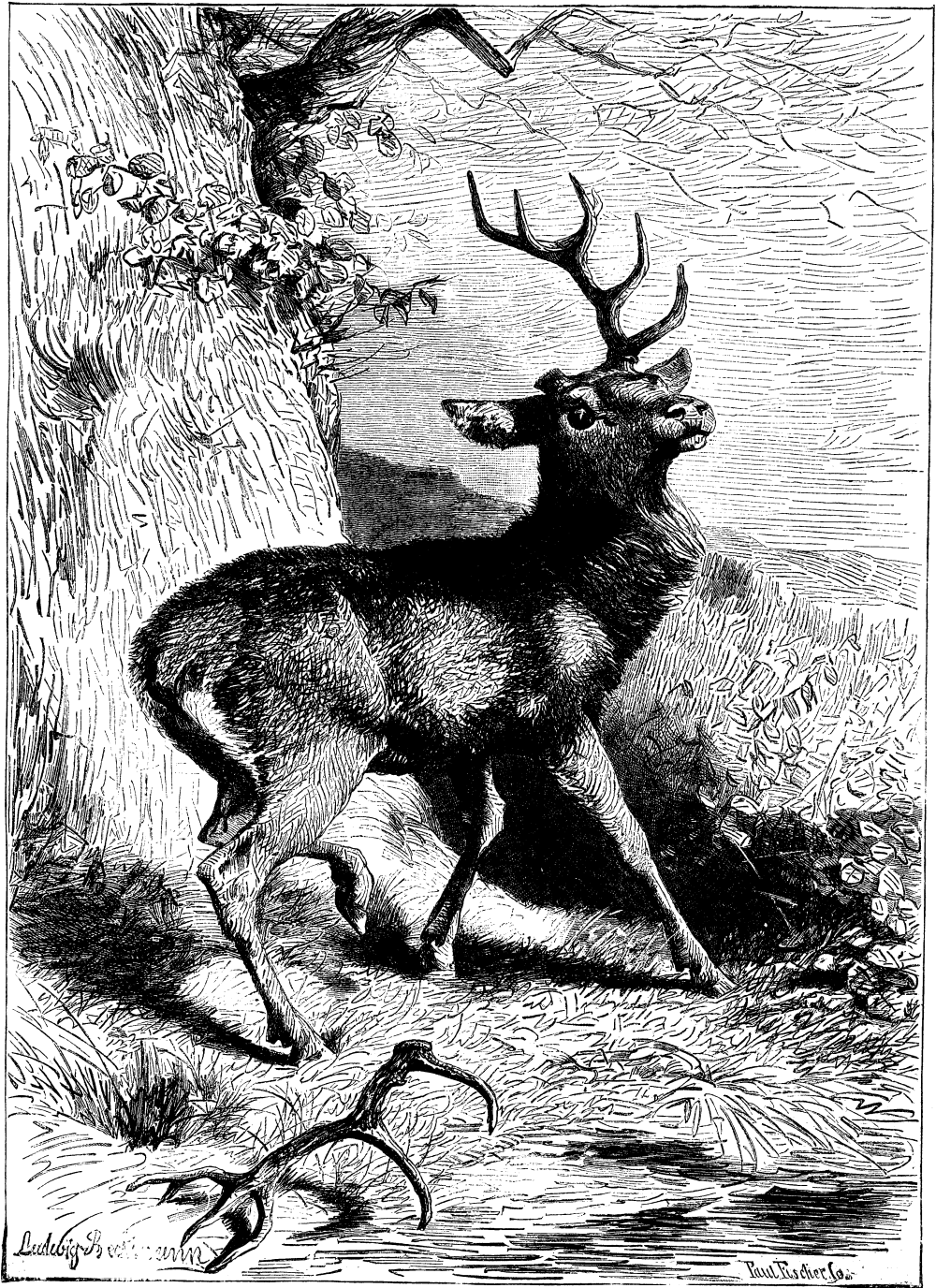 Every year in March the deer loses its antlers, and fresh ones immediately begin to grow, which exceed in size those that have just been lost. Few persons probably have been able to watch and observe the habits of the animal after it has lost its antlers. It will, therefore, be of interest to examine the accompanying drawings, by Mr. L. Beckmann, one of them showing a deer while shedding its antlers, and the other as the animal appears after losing them. In the first illustration the animal has just lost one of its antlers, and fright and pain cause it to throw its head upward and become disturbed and uneasy. The remaining antler draws down one side of the head and is very inconvenient for the animal. The remaining antler becomes soon detached from its base, and the deer turns--as if ashamed of having lost its ornament and weapon--lowers its head, and sorrowfully moves to the adjoining thicket, where it hides. A friend once observed a deer losing its antlers, but the circumstances were somewhat different. The animal was jumping over a ditch, and as soon as it touched the further bank it jumped high in the air, arched its back, bent its head to one side in the manner of an animal that has been wounded, and then sadly approached the nearest thicket, in the same manner as the artist has represented in the accompanying picture. Both antlers dropped off and fell into the ditch.
