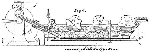Water was dear, and water-heaters were fitted to each engine, by which thirty-three per cent. of the water was again used, thus saving one third. The boilers were of the locomotive type, mostly of steel, to save weight, and thus reduce the cost of transit. The fire-boxes were also made of steel of very soft and ductile quality. A semi-portable engine was made for driving the wash mill. The engine was so arranged that it might be removed from the boiler and placed separately. The boiler was made to work at a pressure of 140 pounds per square inch. Automatic cut off gear was fixed to each engine, and the governors were provided with a spiral spring for adjusting the speed. A screen, or cylinder wash mill and elevator, were used for dealing with the diamantiferous soil, and were described. Standing wires were fixed at the back of the machinery, and passed over a frame fixed at the top of the mine, the end of the mine being secured to strong wooden posts. After the blue soil had been blasted and collected into trucks, it was placed in tubs, which ascended the standing wires. It was then emptied into the depositing box. The yellow soil might be put into the wash mill direct, also that portion of the blue which had passed through the screen fixed over the depositing box. The remainder of the blue, which was spread out to a thickness of four inches or six inches on the depositing ground, some distance from the mine to dry, was delivered into the upper part of the screen. The return water from the elevator, with a portion of fresh water, was also discharged at this point, and operations were thus greatly facilitated, the soil becoming thoroughly saturated, and passing more easily down the shoots. The large pieces which would not drop through the meshes of the screen were discharged into trucks at the lower end and carried away. The smaller pieces with water, in the form of sludge, fell through into a shoot, and thus were conveyed into the wash mill pan, and there kept in constant rotating motion by agitators. The diamonds and other pieces of high specific gravity sank to the deepest part of the pan, and the remainder of the sludge was forced over the inner ledge to the elevator. The sludge was then lifted and thrown upon an inclined screen and down the shoot over the side of the bank. The residue left in the pan at the end of the day's work was passed through a pulsator, in which, by the force of water, the mud and lighter particles were carried away, leaving behind the diamonds, agates, garnets, and other heavy stones. It was the practice occasionally to put a few inferior stones in the soil, to test the efficiency of the machinery.