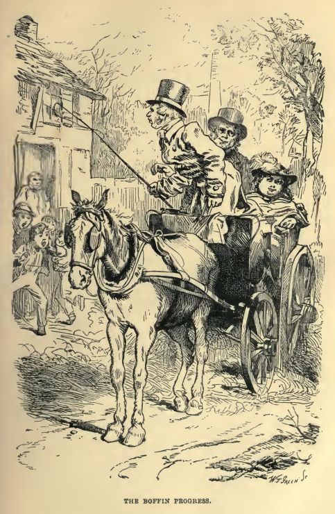 But, the greatest event of all, in the new life of Mr and Mrs John Harmon, was a visit from Mr and Mrs Eugene Wrayburn. Sadly wan and worn was the once gallant Eugene, and walked resting on his wife’s arm, and leaning heavily upon a stick. But, he was daily growing stronger and better, and it was declared by the medical attendants that he might not be much disfigured by-and-by. It was a grand event, indeed, when Mr and Mrs Eugene Wrayburn came to stay at Mr and Mrs John Harmon’s house: where, by the way, Mr and Mrs Boffin (exquisitely happy, and daily cruising about, to look at shops,) were likewise staying indefinitely.