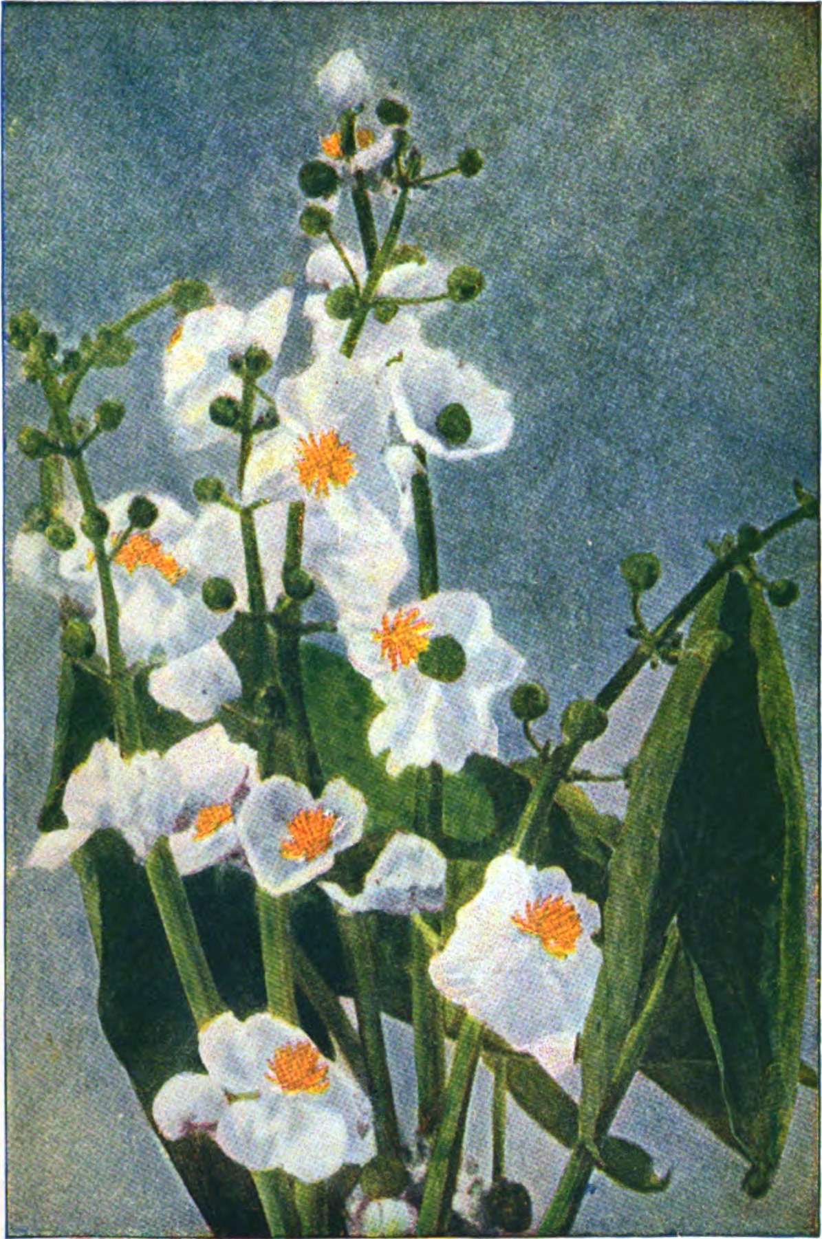 Any plant which elects to grow in shallow water must be amphibious: it must be able to breathe beneath the surface as the fish do, and also be adapted to thrive without those parts that correspond to gills; for ponds and streams have an unpleasant way of drying up in summer, leaving it stranded on the shore. This accounts in part for the variable leaves on the arrow-head, those underneath the water being long and ribbon-like, to bring the greatest possible area into contact with the air with which the water is charged. Broad leaves would be torn to shreds by the current through which grass-like blades glide harmlessly; but when this plant grows on shore, having no longer use for its lower ribbons, it loses them, and expands only broad arrow-shaped surfaces to the sunny air, leaves to be supplied with carbonic acid to assimilate, and sunshine to turn off, the oxygen and store up the carbon into their system.