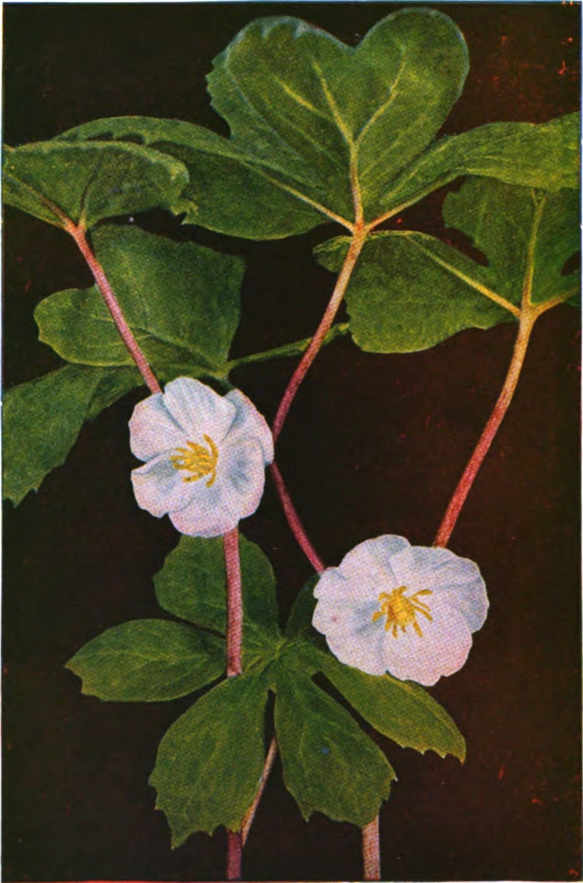 One of the most chastely beautiful of our native wild flowers—so lovely that many shady nooks in English rock-gardens and ferneries contain imported clumps of the vigorous plant—is the Large-flowered Wake-Robin, or White Wood Lily (T. grandiflorum). Under favorable conditions the waxy, thin, white, or occasionally pink, strongly veined petals may exceed two inches; and in Michigan a monstrous form has been found. The broadly rhombic leaves, tapering to a point, and lacking petioles, are seated in the usual whorl of three, at the summit of the stem, which may attain a foot and a half in height; from the centre the decorative flower arises on a long peduncle.