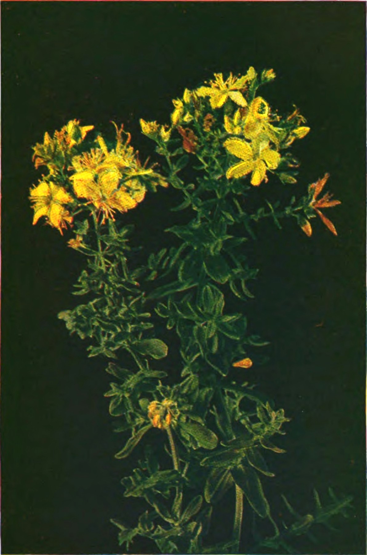 The Rattlesnake-weed, Early or Vein-leaf Hawkweed, Snake or Poor Robin’s Plantain (H. venosum), with flower-heads only about half an inch across, sends up a smooth, slender stem, paniculately branched above, to display the numerous dandelion-yellow disks as early as May, although October is not too late to find this generous bloomer in pine woodlands, dry thickets, and sandy soil. Purplish-veined oval leaves, more or less hairy, that spread in a tuft next the ground, are probably as efficacious in curing shake bites as those of the Rattlesnake Plantain. When a credulous generation believed that the Creator had indicated with some sign on each plant the special use for which each was intended, many leaves were found to have veinings suggesting the marks on a snake’s body; therefore, by simple reasoning, they must extract venom. How delightful is faith cure!