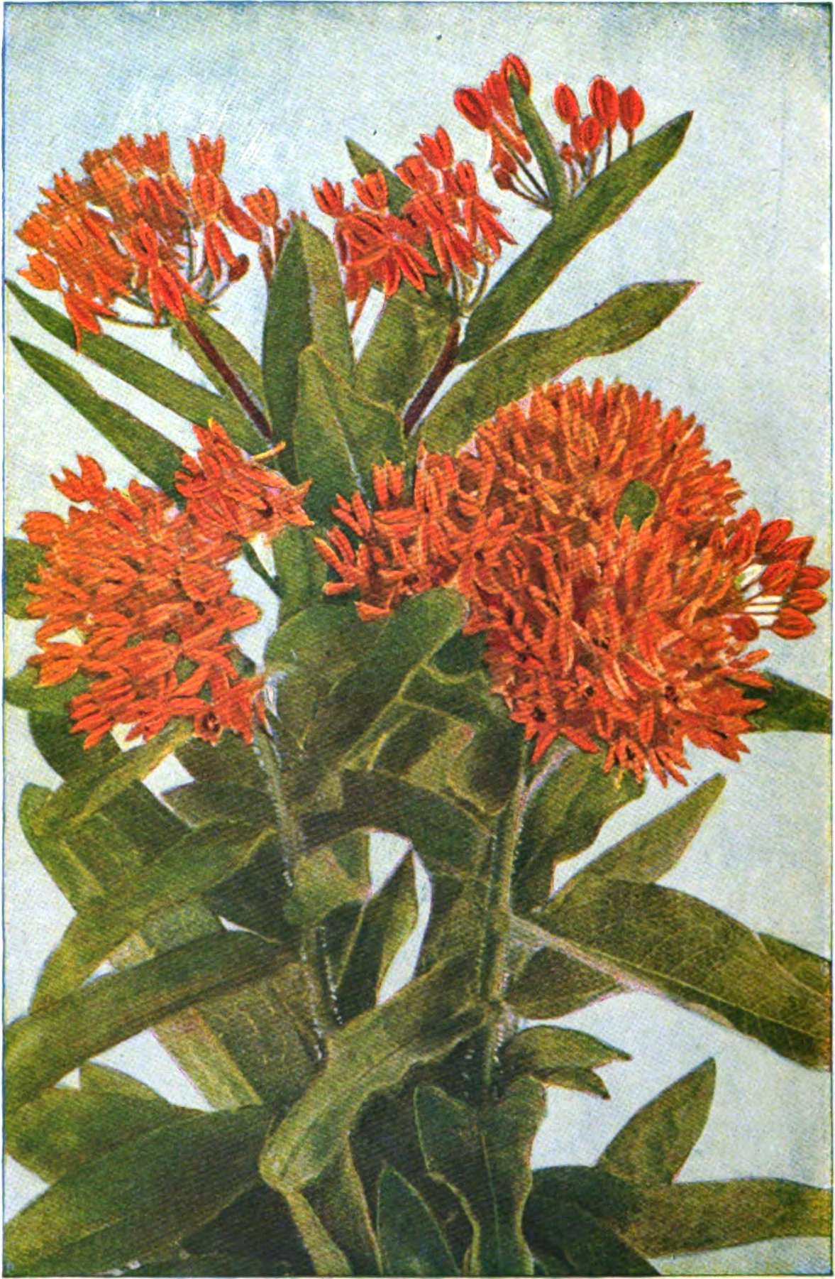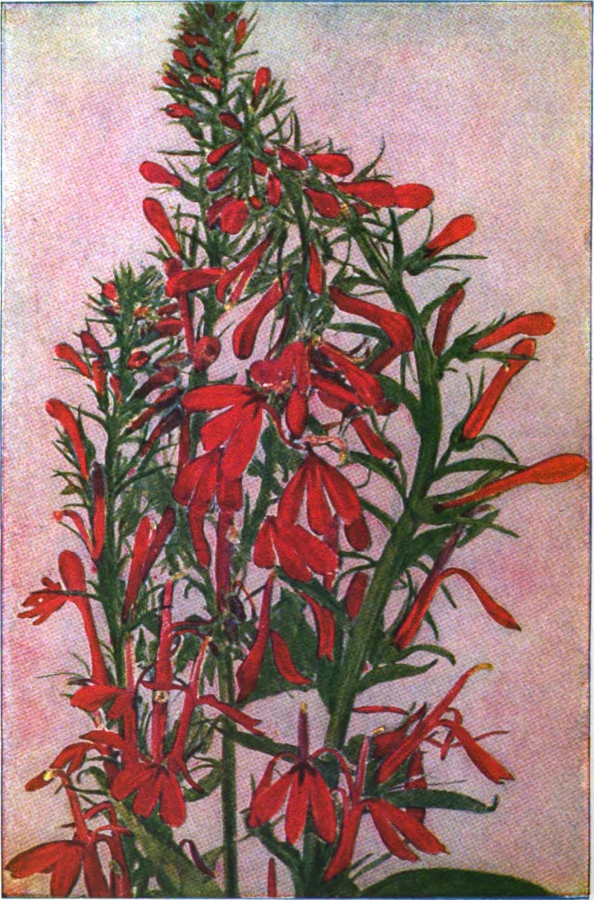 Erect, as if conscious of its striking beauty, this vivid lily lifts a chalice that suggests a trap for catching sunbeams from fiery old Sol. Defiant of his scorching rays in its dry habitat, it neither nods nor droops even during prolonged drought; and yet many people confuse it with the gracefully pendent, swaying bells of the yellow Canada Lily, which will grow in a swamp rather than forego moisture. La, the Celtic for white, from which the family derived its name, makes this bright-hued flower blush to own it. Seedsmen, who export quantities of our superb native lilies to Europe, supply bulbs so cheap that no one should wait four years for flowers from seed, or go without their splendor in our over-conventional gardens.