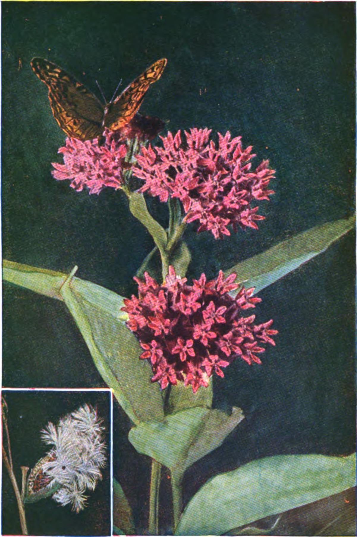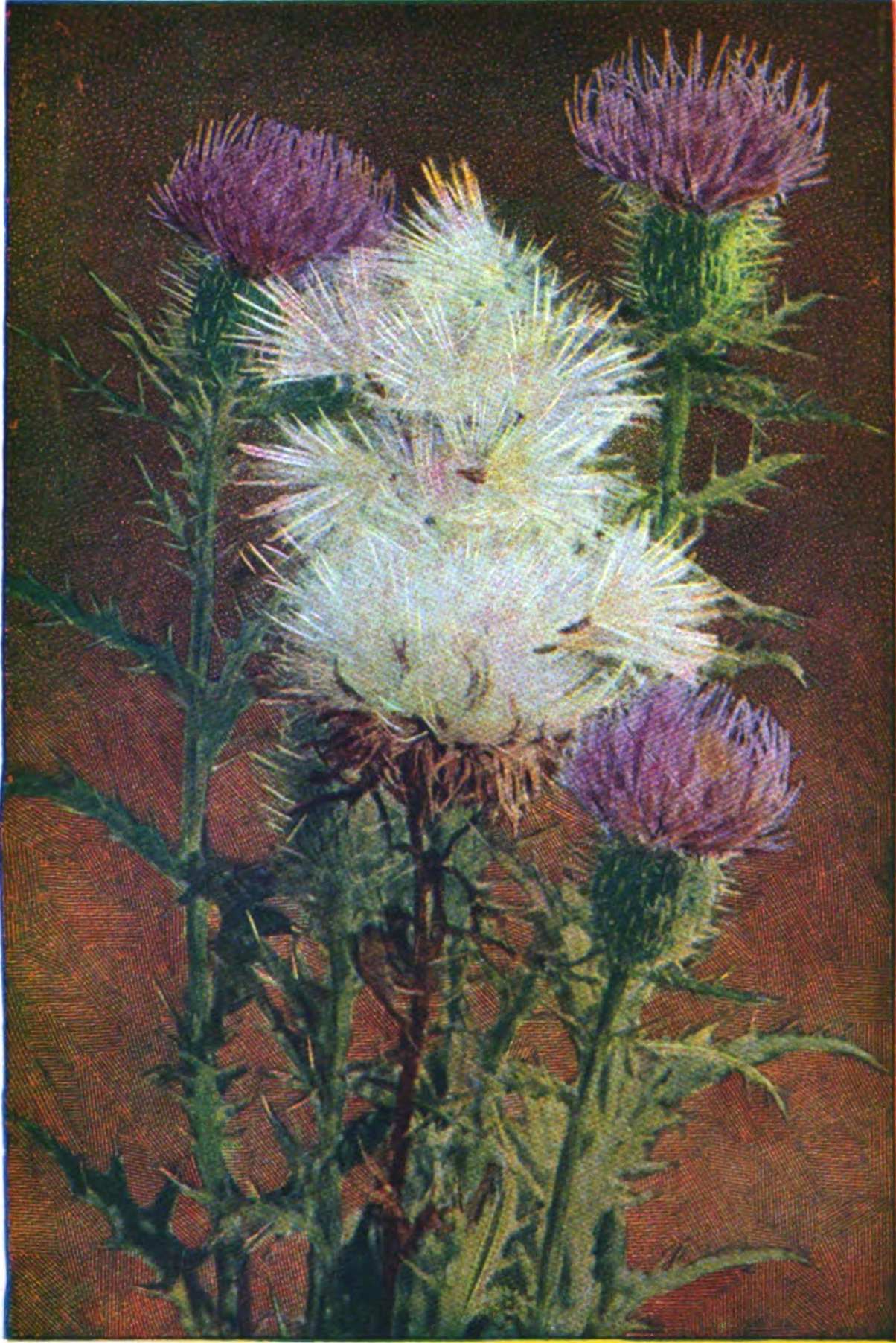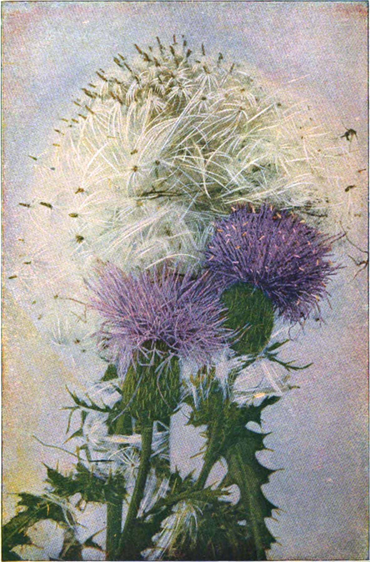 might be the ant’s passionate outburst to the thistle, and the thistle’s reply, instead of a Sir Walter and Queen Elizabeth couplet. Long, lance-shaped, deeply cleft, sharply pointed, and prickly dark green leaves make the ascent almost unendurable; nevertheless, the ant bravely mounts to where the bristle-pointed, overlapping scales of the deep green cup hold the luscious flowers. Now his feet becoming entangled in the cottony fibres wound about the scaly armor, and a bristling bodyguard thrusting spears at him in his struggles to escape, death happily releases him. All this tragedy to insure the thistle’s cross-fertilized seed that, seated on the autumn winds, shall be blown far and wide in quest of happy conditions for the offspring!