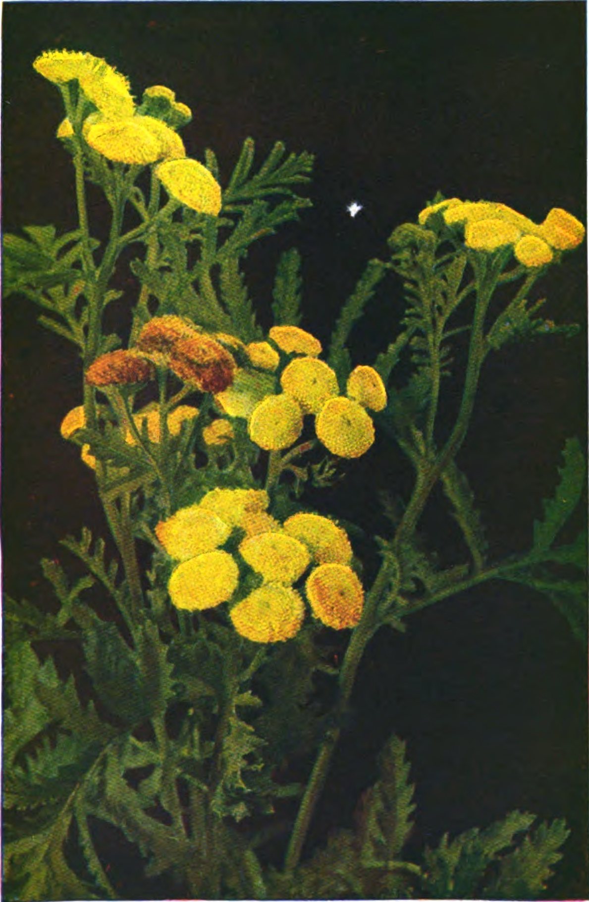 “In the spring time, are made with the leaves hereof newly sprung up, and with eggs, cakes or Tansies which be pleasant in taste and goode for the Stomache,” wrote quaint old Gerarde. That these were popular dainties in the seventeenth century we further know through Pepys who made a “pretty dinner” for some guests, to wit: “A brace of stewed carps, six roasted chickens, and a jowl of salmon, hot, for the first course; a tansy, and two neat’s tongues, and cheese, the second.” Cole’s “Art of Simpling,” published in 1656, assures maidens that tansy leaves laid to soak in buttermilk for nine days “maketh the complexion very fair.” Tansy tea, in short, cured every ill that flesh is heir to, according to the simple faith of medieval herbalists—a faith surviving in some old women even to this day. The name is said to be a corruption of athanasia, derived from two Greek words meaning immortality. When some monks in reading Lucian came across the passage where Jove, speaking of Ganymede to Mercury, says, “Take him hence, and when he has tasted immortality let him return to us,” their literal minds inferred that this plant must have been what Ganymede tasted, hence they named it athanasia! So great credence having been given to its medicinal powers in Europe, it is not strange the colonists felt they could not live in the New World without tansy. Strong-scented pungent tufts topped with bright yellow buttons—runaways from old gardens—are a conspicuous feature along many a roadside leading to colonial homesteads.