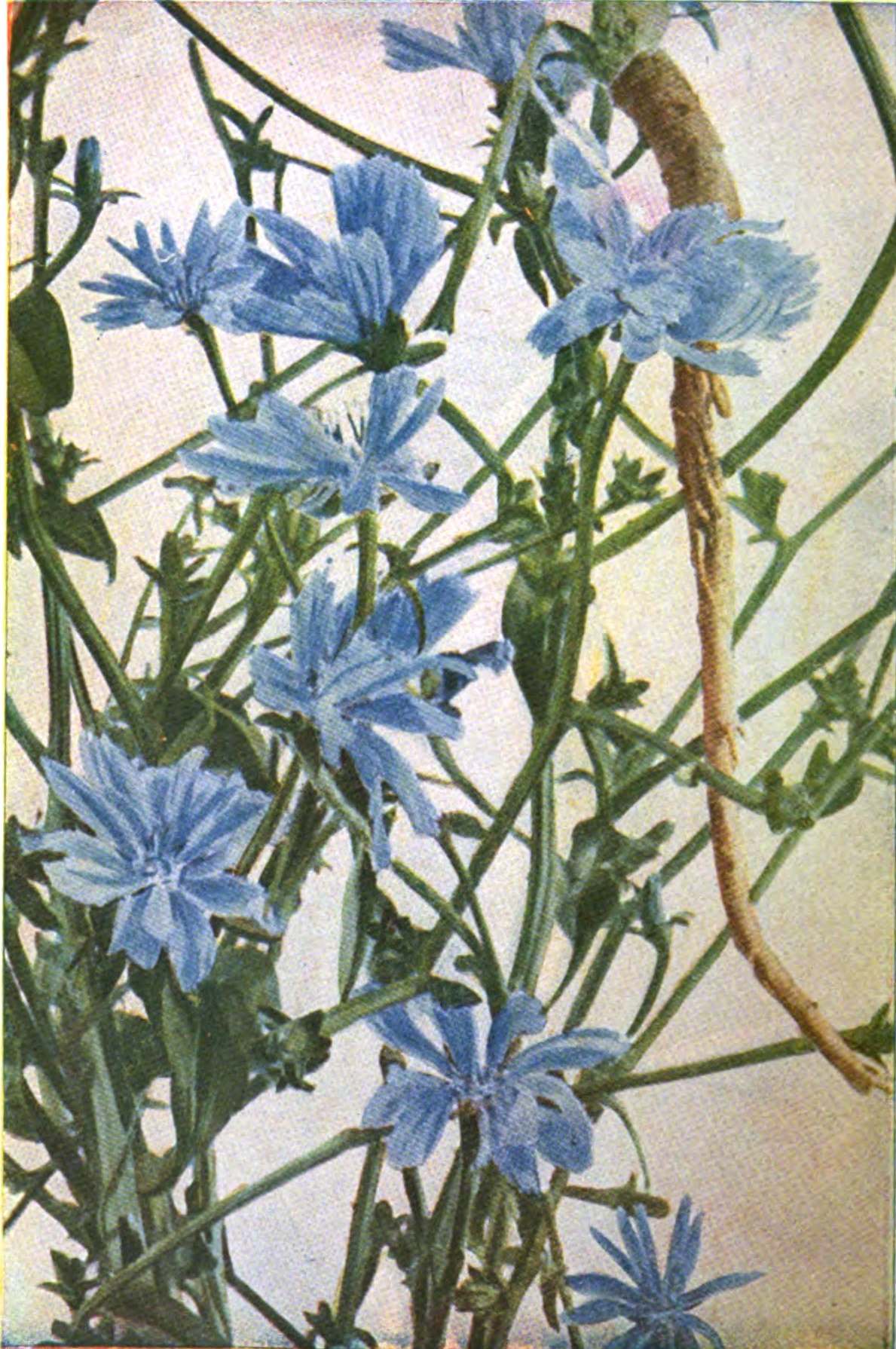 At least the dried and ground root of this European invader is known to hosts of people who buy it undisguised or not, according as they count it an improvement to their coffee or a disagreeable adulterant. So great is the demand for chicory that, notwithstanding its cheapness, it is often in its turn adulterated with roasted wheat, rye, acorns, and carrots. Forced and blanched in a warm, dark place, the bitter leaves find a ready market as a salad known as “barbe de Capucin” by the fanciful French. Endive and dandelion, the chicory’s relatives, appear on the table, too in spring, where people have learned the possibilities of salads, as they certainly have in Europe.