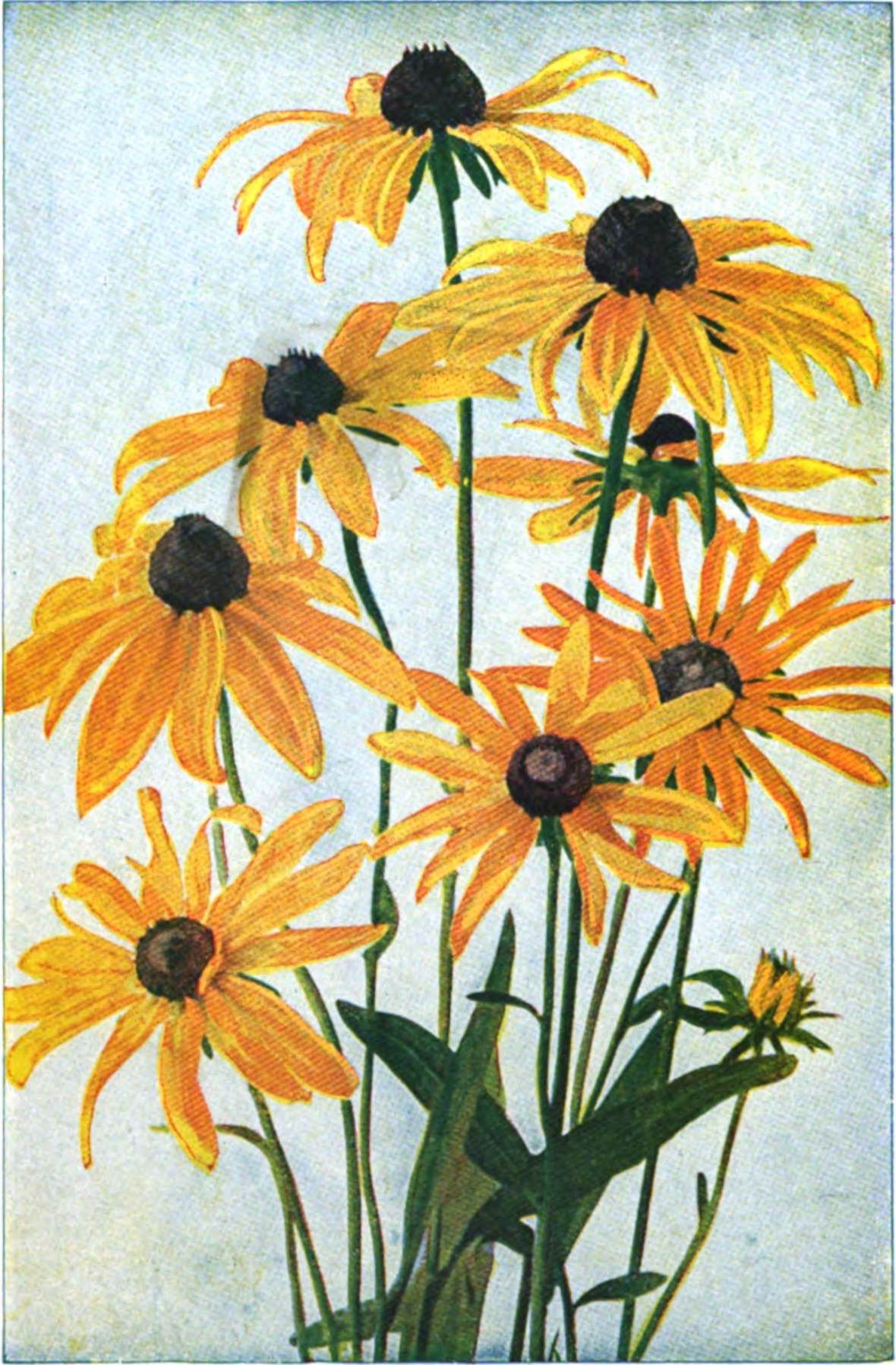 So very many weeds having come to our Eastern shores from Europe, and marched farther and farther west year by year, it is but fair that black-eyed Susan, a native of Western clover fields, should travel toward the Atlantic in bundles of hay whenever she gets the chance, to repay Eastern farmers in their own coin. Do these gorgeous heads know that all our showy rudbeckias—some with orange red at the base of their ray florets—have become prime favorites of late years in European gardens, so offering them still another chance to overrun the Old World, to which so much American hay is shipped? Thrifty farmers may decry the importation into their mowing lots, but there is a glory to the cone-flower beside which the glitter of a gold coin fades into paltry nothingness. Having been instructed in the decorative usefulness of all this genus by European landscape gardeners, we Americans now importune the Department of Agriculture for seeds through members of Congress, even Representatives of States that have passed stringent laws against the dissemination of “weeds.” Inasmuch as each black-eyed Susan puts into daily operation the business methods of the white daisy, methods which have become a sort of creed for the entire composite horde to live by, it is plain that she may defy both farmers and legislators. Bees, wasps, flies butterflies, and beetles could not be kept away from an entertainer so generous; for while the nectar in the deep, tubular brown florets may be drained only by long, slender tongues, pollen is accessible to all. Any one who has had a jar of these yellow daisies standing on a polished table indoors, and tried to keep its surface free from a ring of golden dust around the flowers, knows how abundant their pollen is. The black-eyed Susan, like the English sparrow, has come to stay—let farmers and law-makers do what they will.