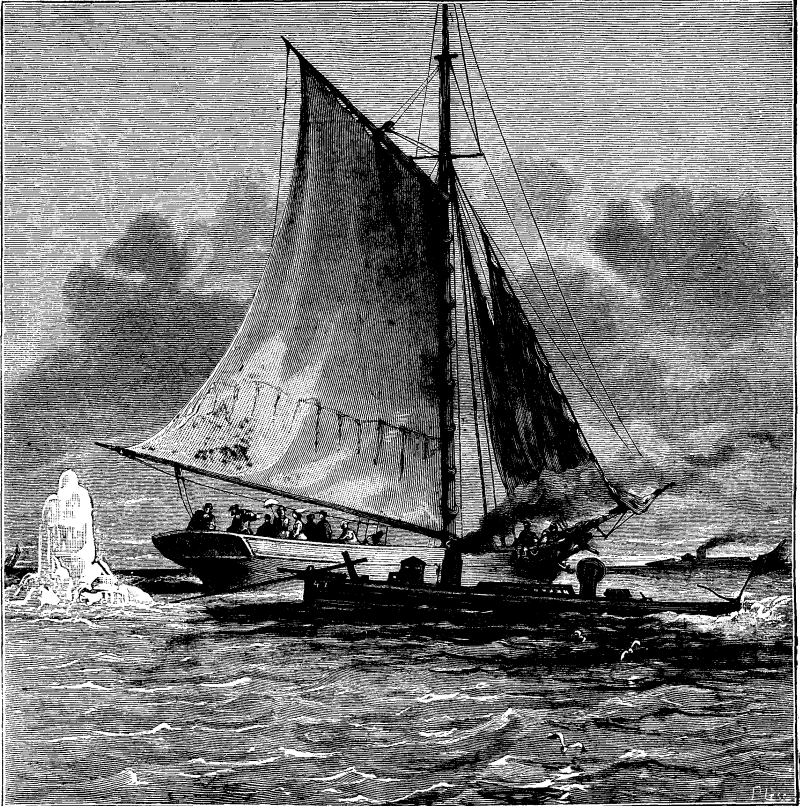 All our ports are provided with flotillas and torpedo boats, and with schools in which the officers and men charged with this service are trained by frequent exercises. It was near L'Orient, at Port Louis, that we were permitted to be witnesses of these maneuvers, and where we saw the torpedo boats that were lying in ambush behind Rohellan Isle glide between the rocks, all of which appeared familiar to them, and start out seaward at the first signal. It was here, too, that we were witnesses of the sham attack against a pleasure yacht, shown in one of our engravings. A torpedo boat, driven at full speed, stopped at one meter from the said yacht with a precision that denoted an oft-repeated study.