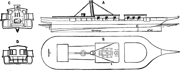 There is another system which is likewise in use in the French navy, and that is the Whitehead torpedo. This consists of a metallic cylinder, tapering at each end, and containing not only a charge of gun cotton, but a compressed air engine which actuates two helices. It is, in fact, a small submarine vessel, which moves of itself in the direction toward which it has been launched, and at a depth that has been regulated beforehand by a special apparatus which is a secret with the inventor. The torpedo is placed in a tube situated in the fore part of the torpedo boat, and whence it is driven out by means of compressed air. Once fired, it makes its way under the surface to the spot where the shock of its point is to bring about an explosion, and the torpedo boat is thus enabled to operate at a distance and avoid the dangers of an immediate contact with the enemy. Unfortunately this advantage is offset by grave drawbacks; for, in the first place, each of the Whitehead torpedoes costs about ten thousand francs, without counting the expense of obtaining the right to use the patent, and, in the second place, its action is very uncertain, since currents very readily change its direction. However this may be, the inventor has realized a considerable sum by the sale of his secret to the different maritime powers, most of whom have adopted his system.