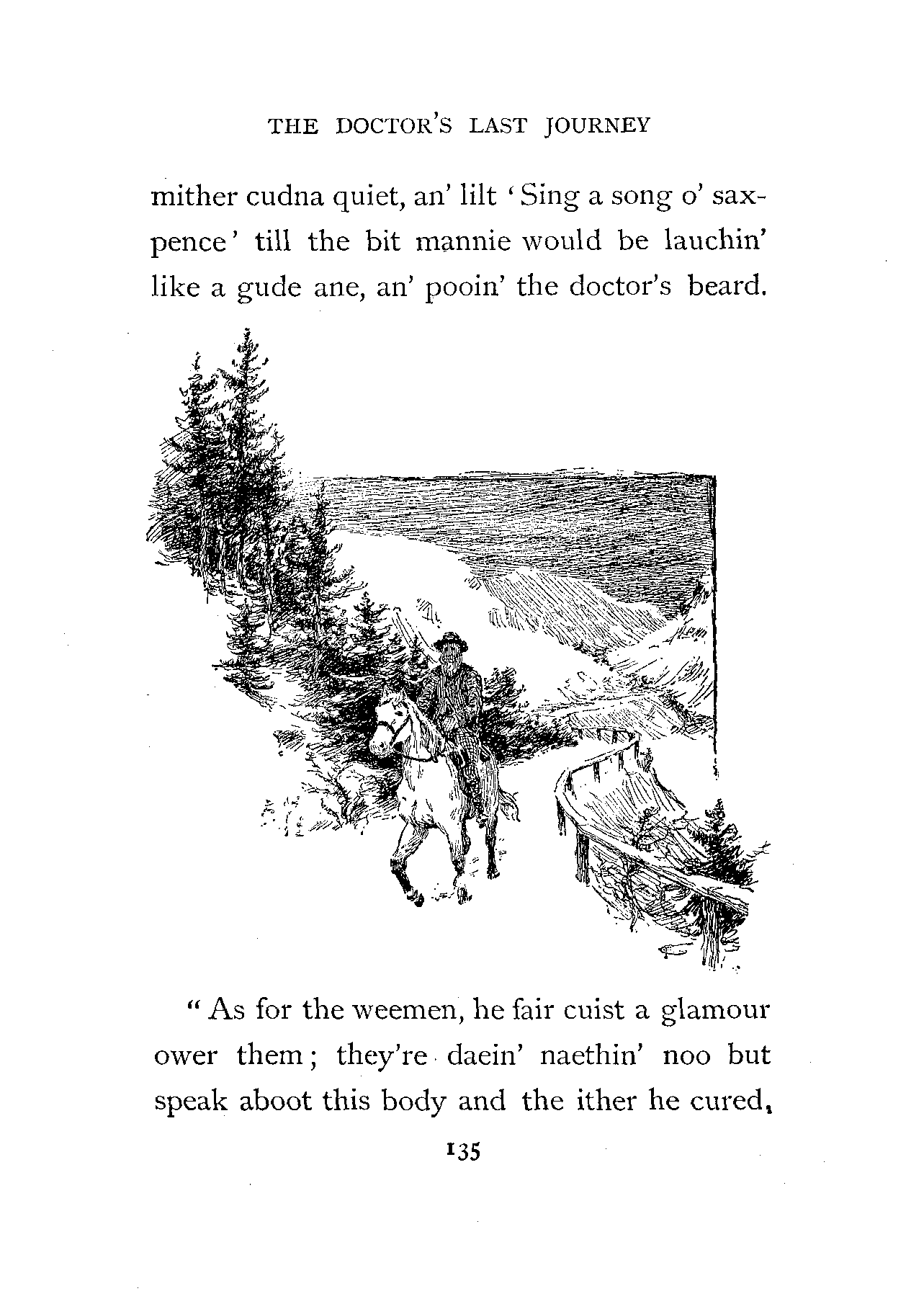 "Yon's the licht in the kitchen window; nae wonder ye're nickering (neighing).... it's been a stiff journey; a'm tired, lass.... a'm tired tae deith," and the voice died into silence.