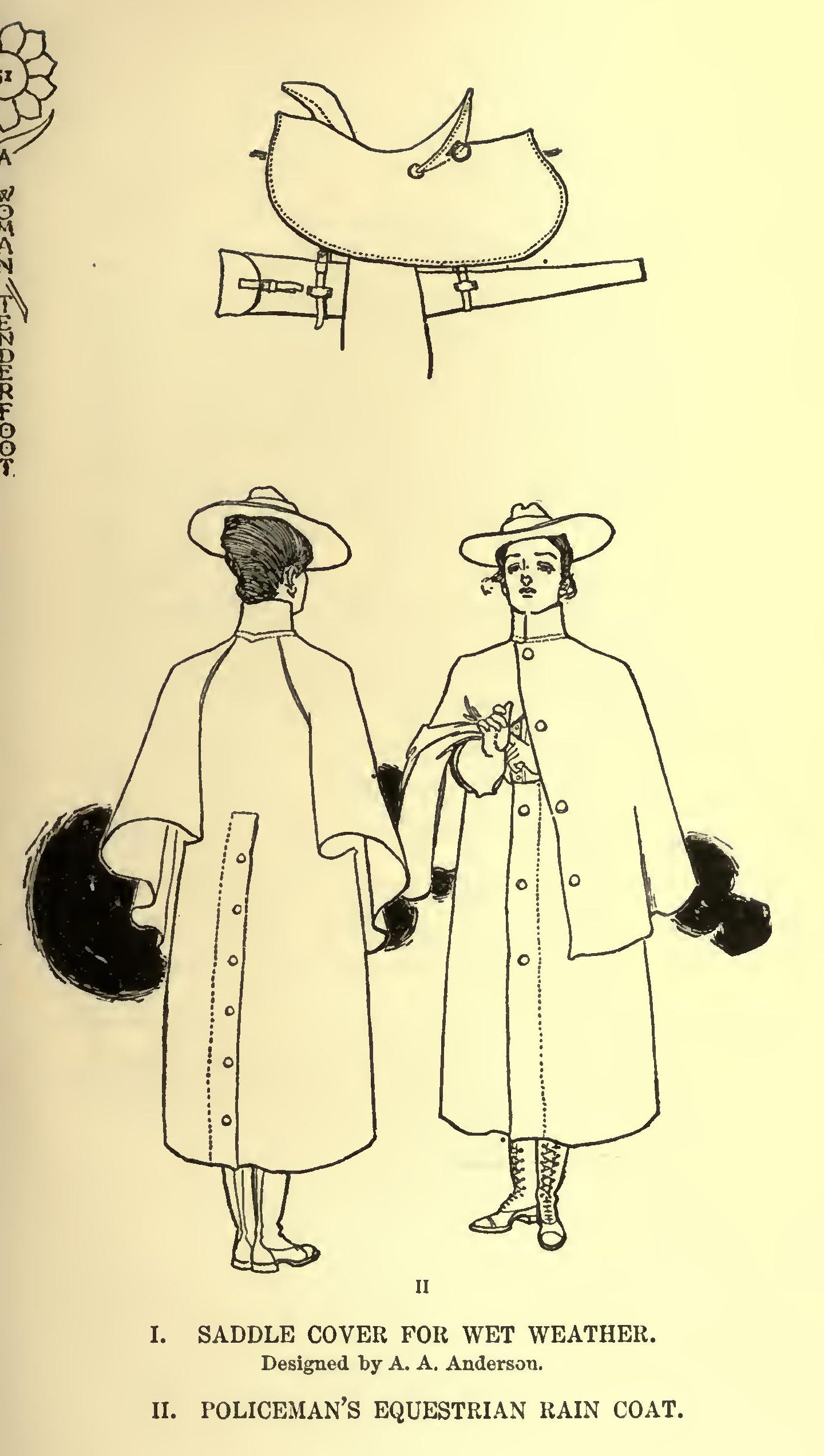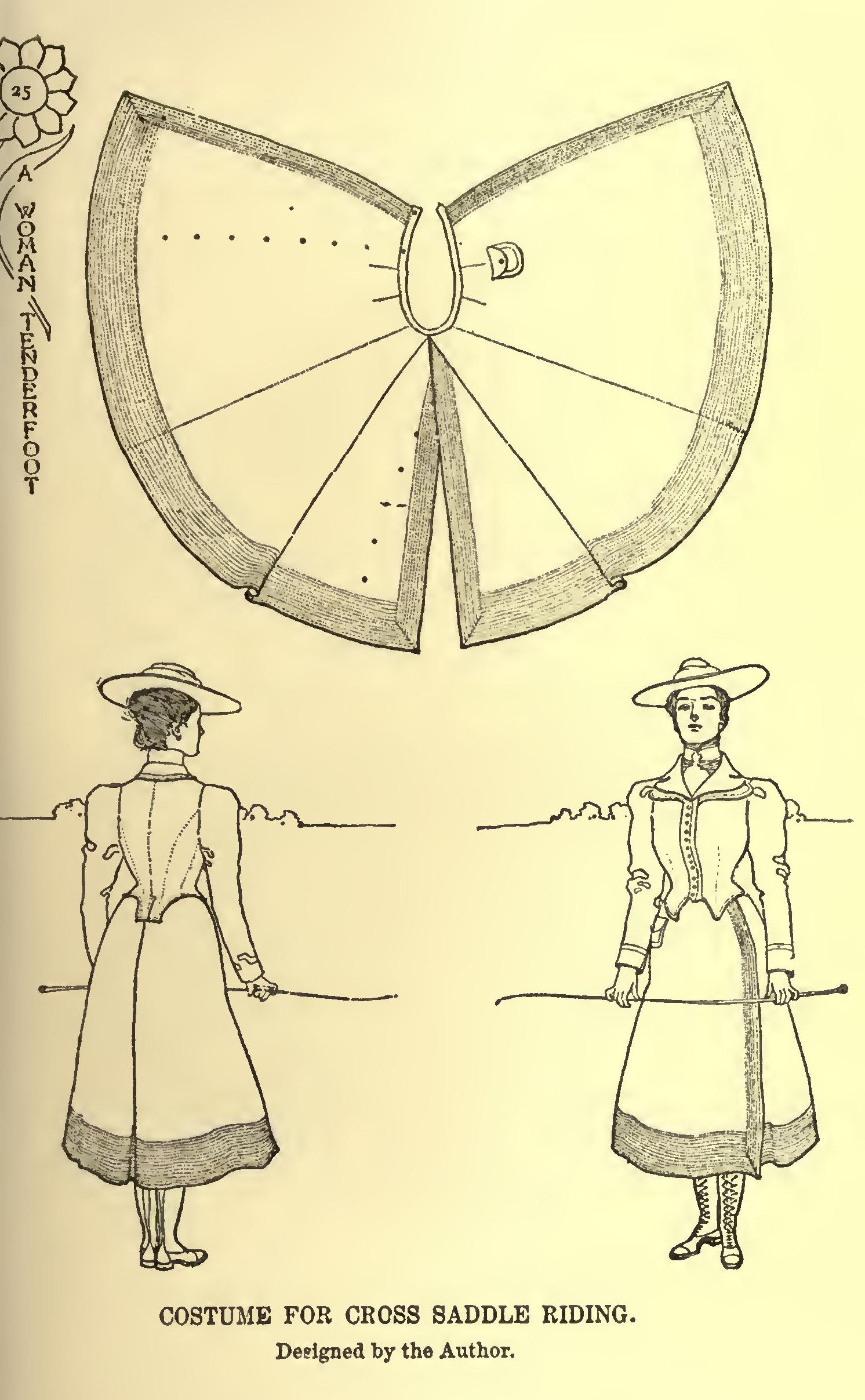 In Western life you are on and off your horse at the change of a thought. Your horse is not an animate exercise-maker that John brings around for a couple of hours each morning; he is your companion, and shares the vicissitudes of your life. You even consult him on occasion, especially on matters relating to the road. Therefore your costume must look equally well on and off the horse. In meeting this requirement, my woes were many. I struggled valiantly with everything in the market, and finally, from five varieties of divided skirts and bloomers, the following practical and becoming habit was evolved.