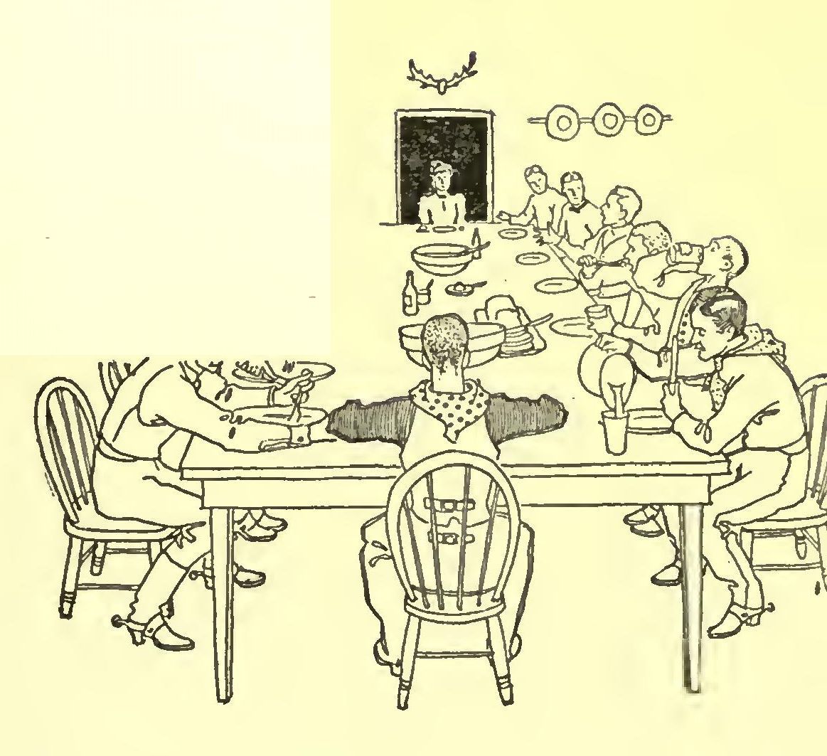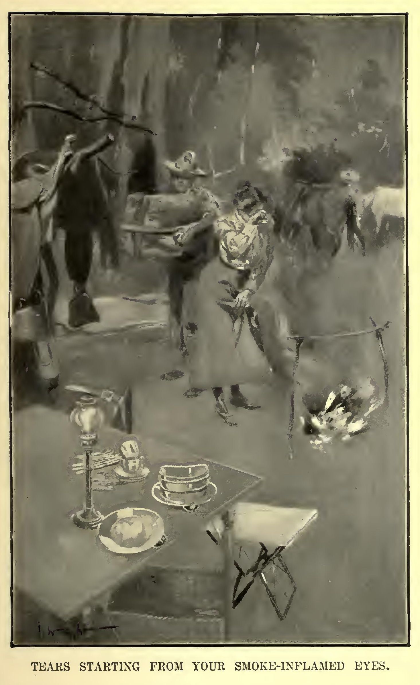 I wish that I could put a charm over the next few words so that only the woman reader could understand, but as I cannot I must repeat boldly: Dear woman who goes hunting with her husband, be sure that you have it understood that you do no cooking, or dishwashing. I think that the reason women so often dislike camping out is because the only really disagreeable part of it is left to them as a matter of course. Cooking out of doors at best is trying, and certainly you cannot be care free, camp-life's greatest charm, when you have on your mind the boiling of prunes and beans, or when tears are starting from your smoke-inflamed eyes as you broil the elk steak for dinner. No, indeed! See that your guide or your horse wrangler knows how to cook, and expects to do it. He is used to it, and, anyway, is paid for it. He is earning his living, you are taking a vacation.