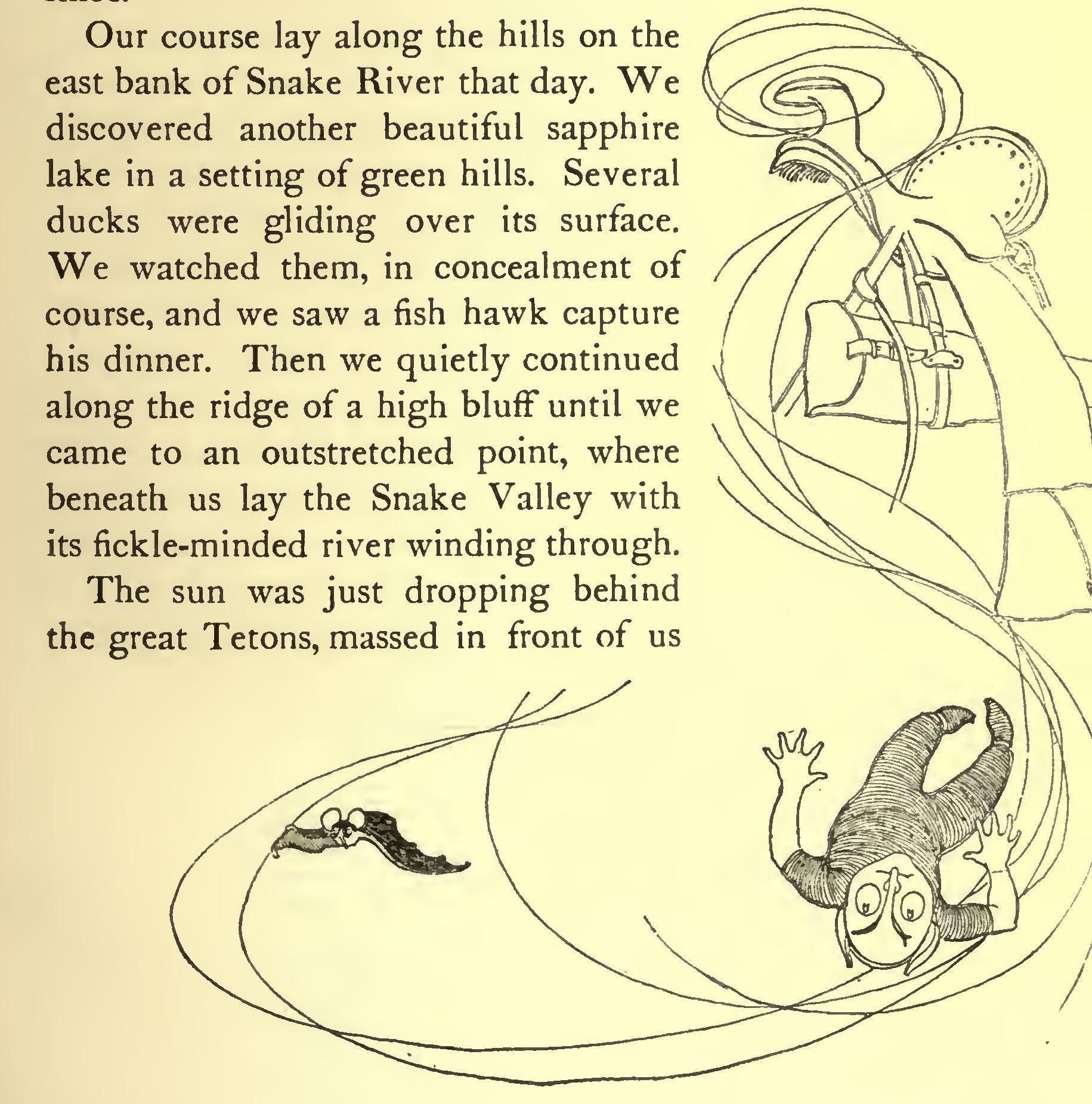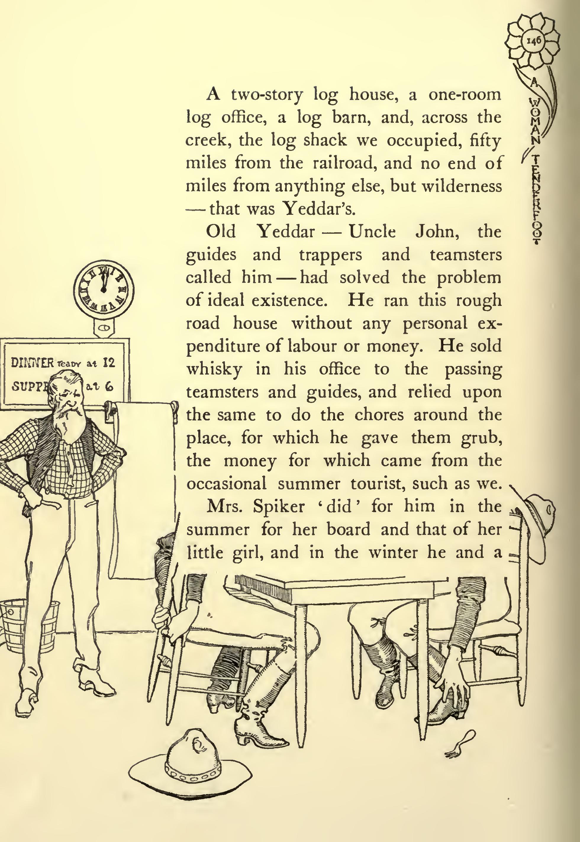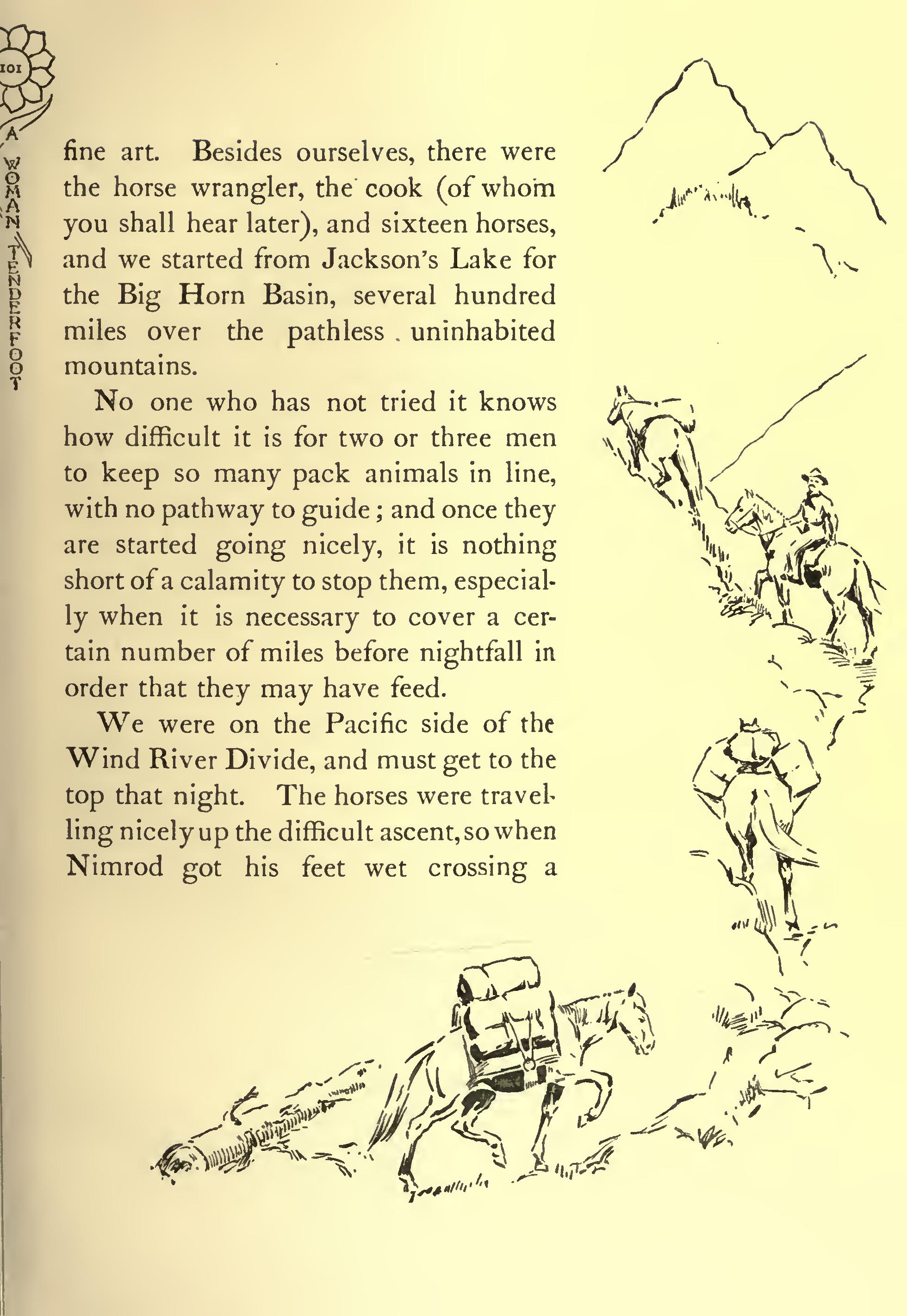 Theoretically, I have always agreed with the Quaker wife who reformed her husband—"Whither thou goest, I go also, Dicky dear." What thou doest, I do also, Dicky dear. So when, the year after our marriage, Nimrod announced that the mountain madness was again working in his blood, and that he must go West and take up the trail for his holiday, I tucked my summer-watering-place-and-Europe-flying-trip mind away (not without regret, I confess) and cautiously tried to acquire a new vocabulary and some new ideas.