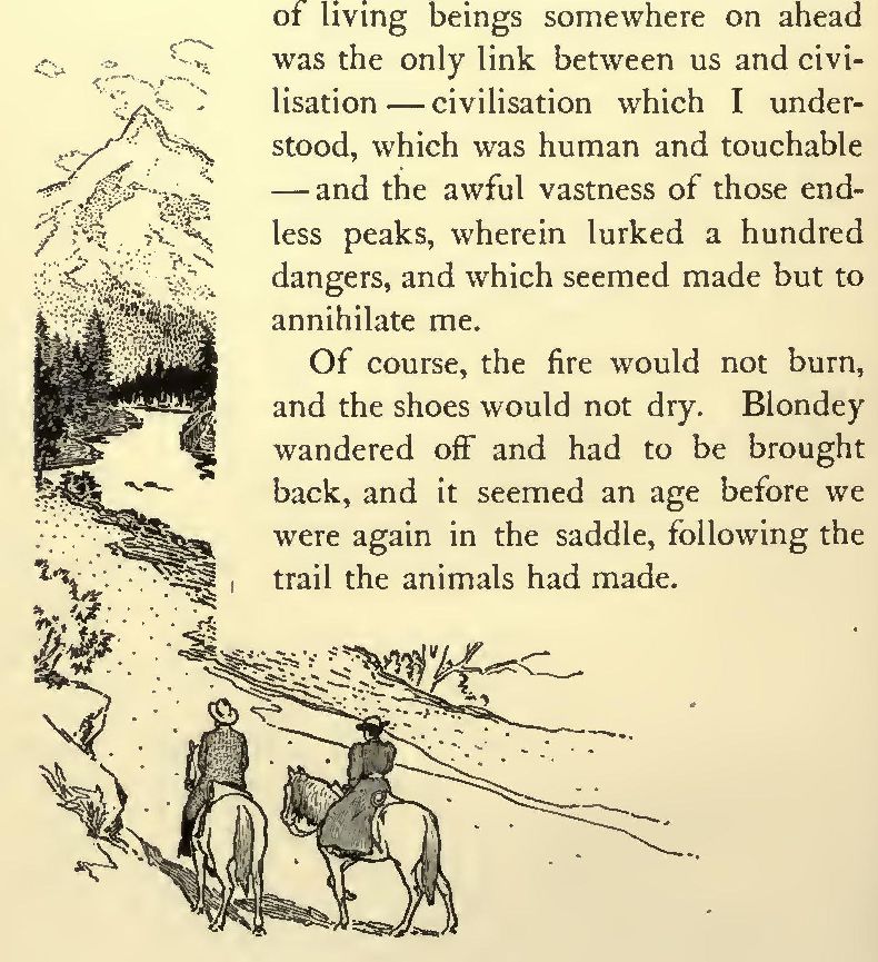 Besides being unable to mount and dismount without assistance it is very difficult to get side-saddle broken horses, and it usually means a horse so broken in health and spirits that he does not care what is being strapped on his back and dangling on one side of him only. And to be on such an animal means that you are on the worst mount of the outfit, and I am sure that it requires little imagination on any one's part to know therein lies misery. Oh! the weariness of being the weakest of the party and the worst mounted—to be always at the tail end of the line, never to be able to keep up with the saddle horses when they start off for a canter, to expend your stock of vitality, which you should husband for larger matters, in urging your beast by voice and quirt to further exertion! Never place yourself in such a position. The former you cannot help, but you can lessen it by making use of such aids to greater independence as wearing short skirts and riding astride, and having at least as good a horse as there is in the outfit. Then you will get the pleasure from your outing that you have the right to expect—that is, if you adhere to one other bit of advice, or rather two.