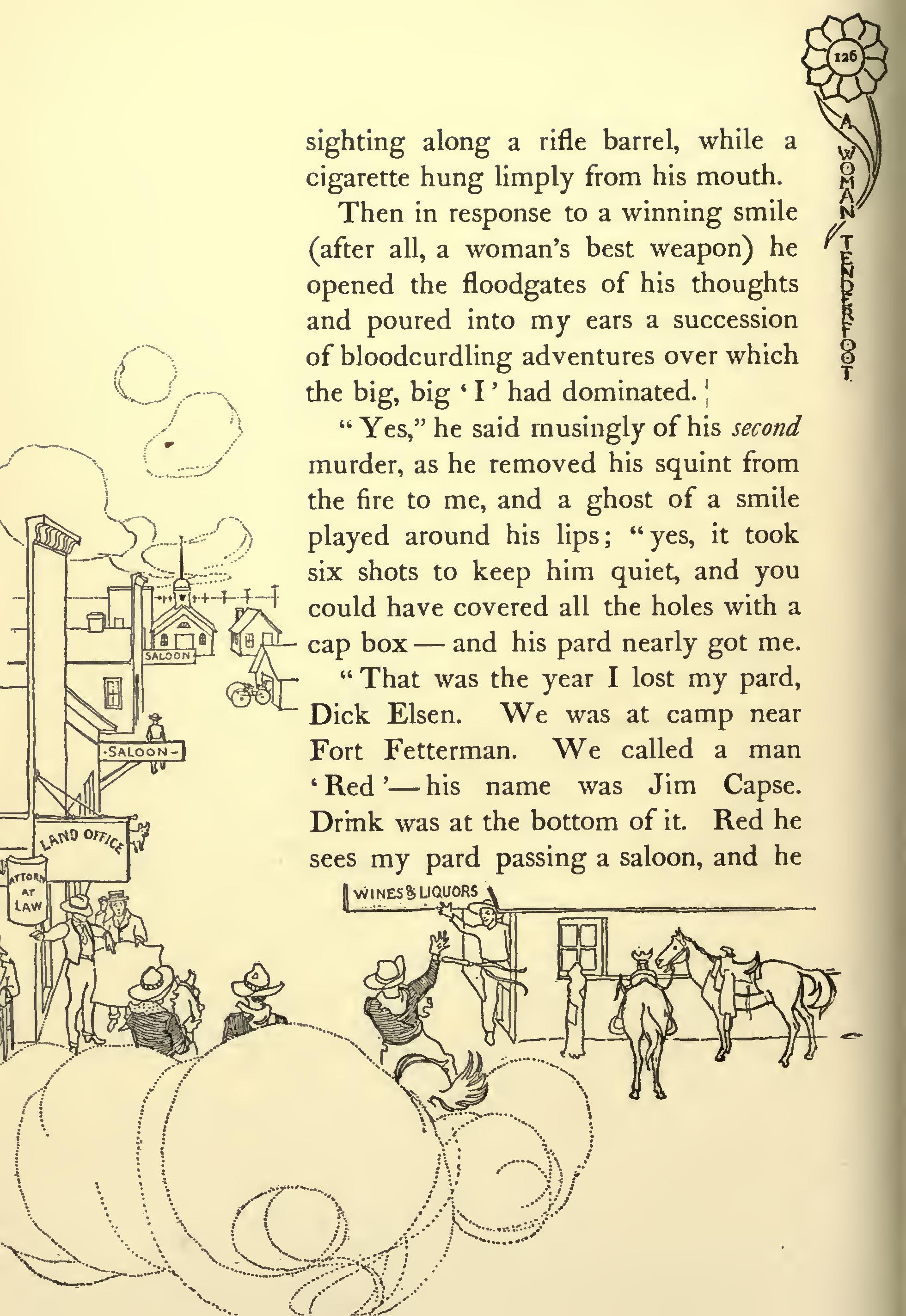 I have been nearly frozen eleven thousand feet in air in blinding snow, I have baked on the Dakota plains with the thermometer at 116 degrees, and I have met characters as diverse as the climate. I know what it means to be a miner and a cowboy, and have risked my life when need be, but, best of all, I have felt the charm of the glorious freedom, the quick rushing blood, the bounding motion, of the wild life, the joy of the living and of the doing, of the mountain and the plain; I have learned to know and feel some, at least, of the secrets of the Wild Ones. In short, though I am still a woman and may be tender, I am a Woman Tenderfoot no longer.