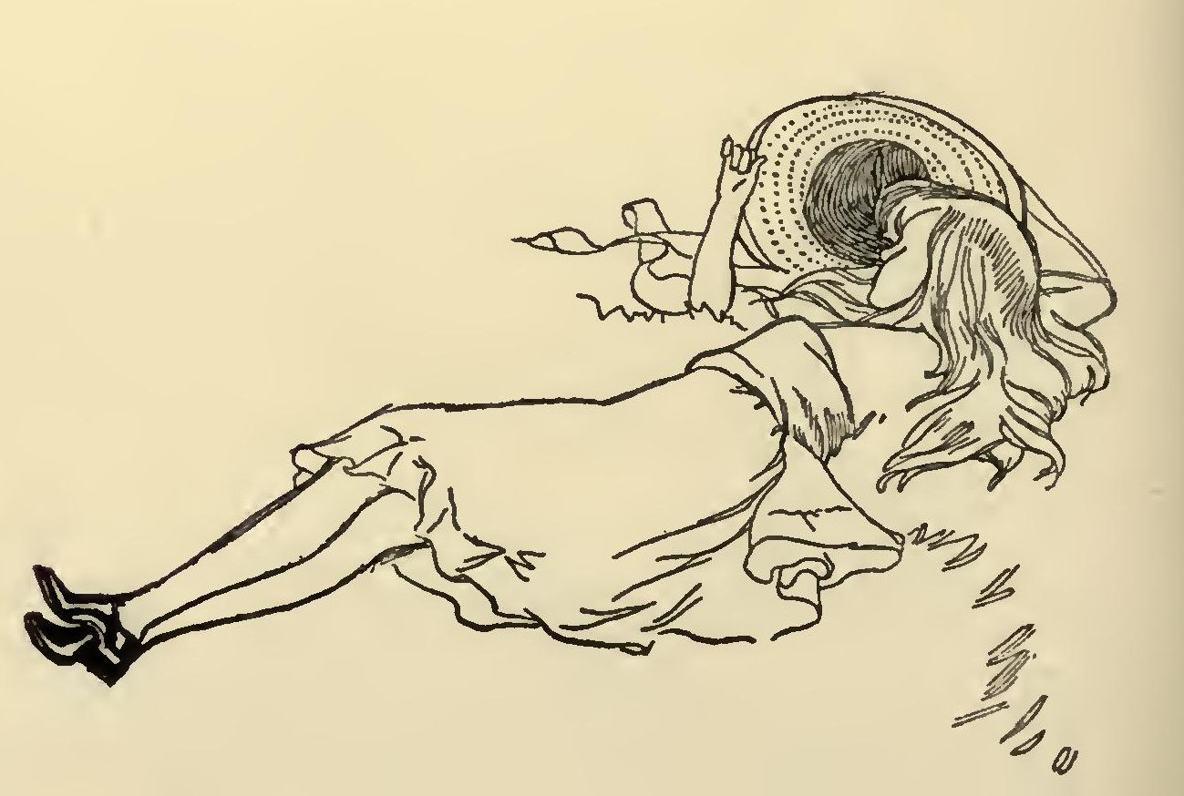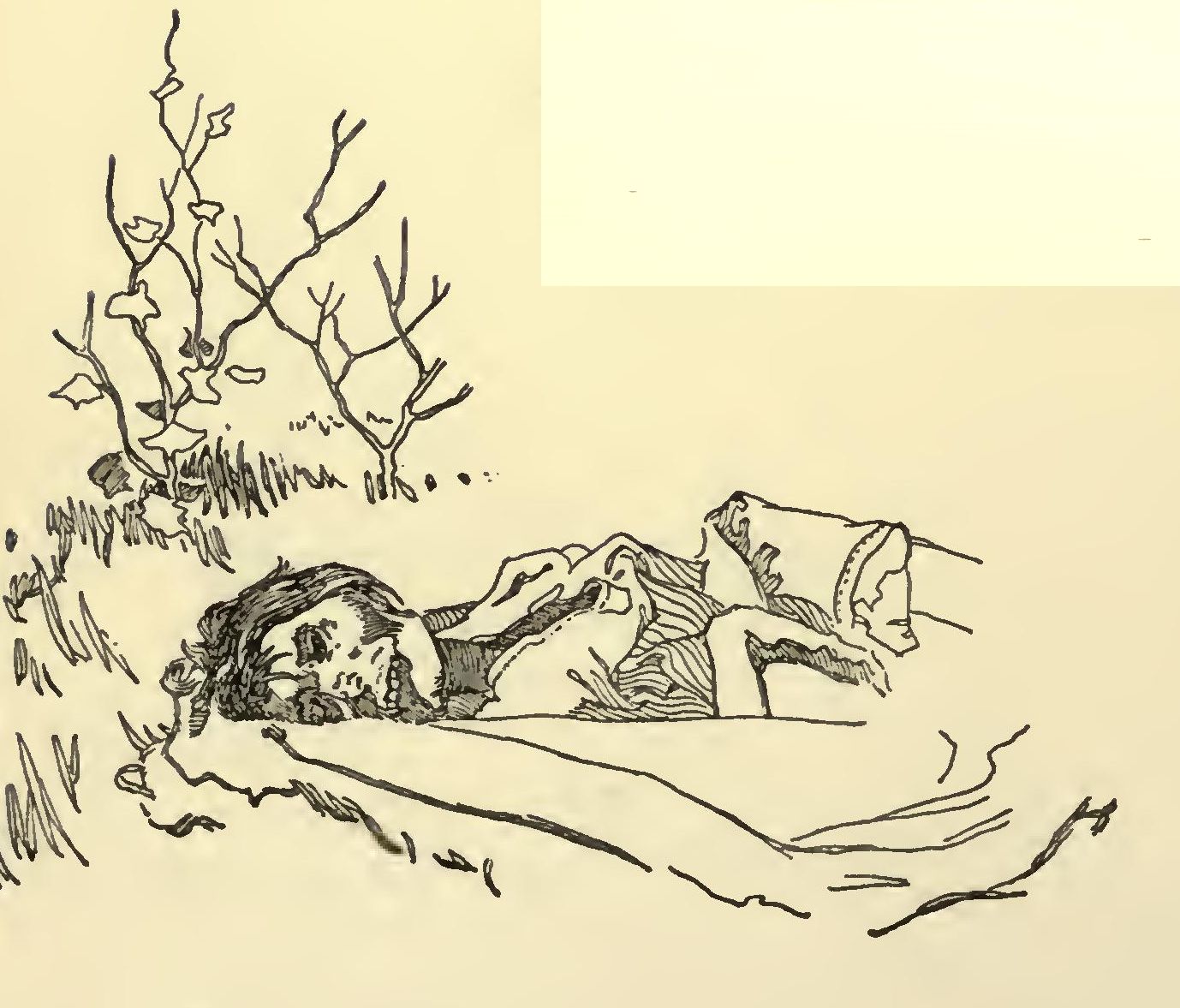 One hour later. Train stops for ten minutes. I got out for fresh air and promenade on platform. Behold, the first object that meets my gaze is the sick lady, miraculously recovered. She swooped down upon me with the deadly light of determination in her eyes. I was discovered. There was no escape. I was going to be thanked—and I was thanked. Up and down, backwards and forwards, inside and out, and all hands around. And when she paused breathless her husband took up the theme. It seems she was a semi invalid, and the sweet peas were quite the most heavenly thing that could have happened to her. Nimrod joined me at this moment and he was thanked separately and dually, for being the husband of his wife, I suppose. At last we were able to retire with profuse bows, tired but exceedingly thankful that the incident, though trying, was ended.