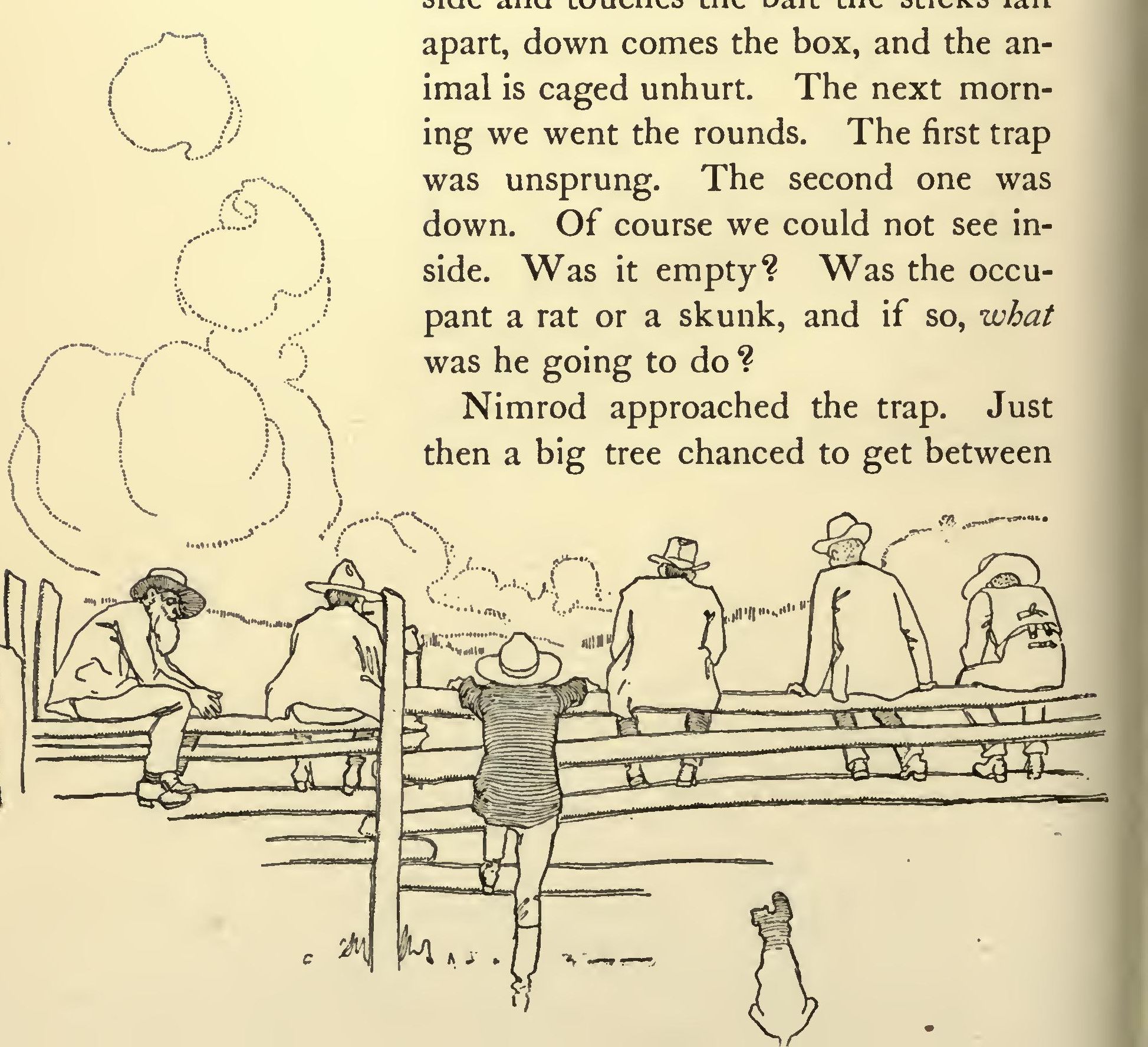 Then, oh, the joy of that round up dinner! The 'WB' outfit had a meal tent, a mess wagon, and a cook for the men, and a rope corral, food and water for the horses. Everybody was happy for the noon hour, save the unlucky ones whose turn it was to guard the herd. Bob had driven the ex-mayor's wife, the sad eyed spinster, and Nimrod over to join us at dinner. The boss greeted Nimrod with the assurance that I was 'all right' and could apply any time for a job. I may as well say that Nimrod had allowed me to go without him in the morning, because the cattle business was no novelty to him; because daybreak rising did not appeal to him as a pastime; and because, at the time I broached the subject, being engaged in writing a story, he had removed but one-eighth of his mind for the consideration of mundane affairs, and that, as any one knows, is insufficient to judge fairly whether the winged thing I was reaching out for was a fly or a bumble bee. In the morning, the story being finished and the other seven-eights of brain at liberty to dwell upon the same question, he decided to follow me, with the result that in the afternoon I rode in the wagon.