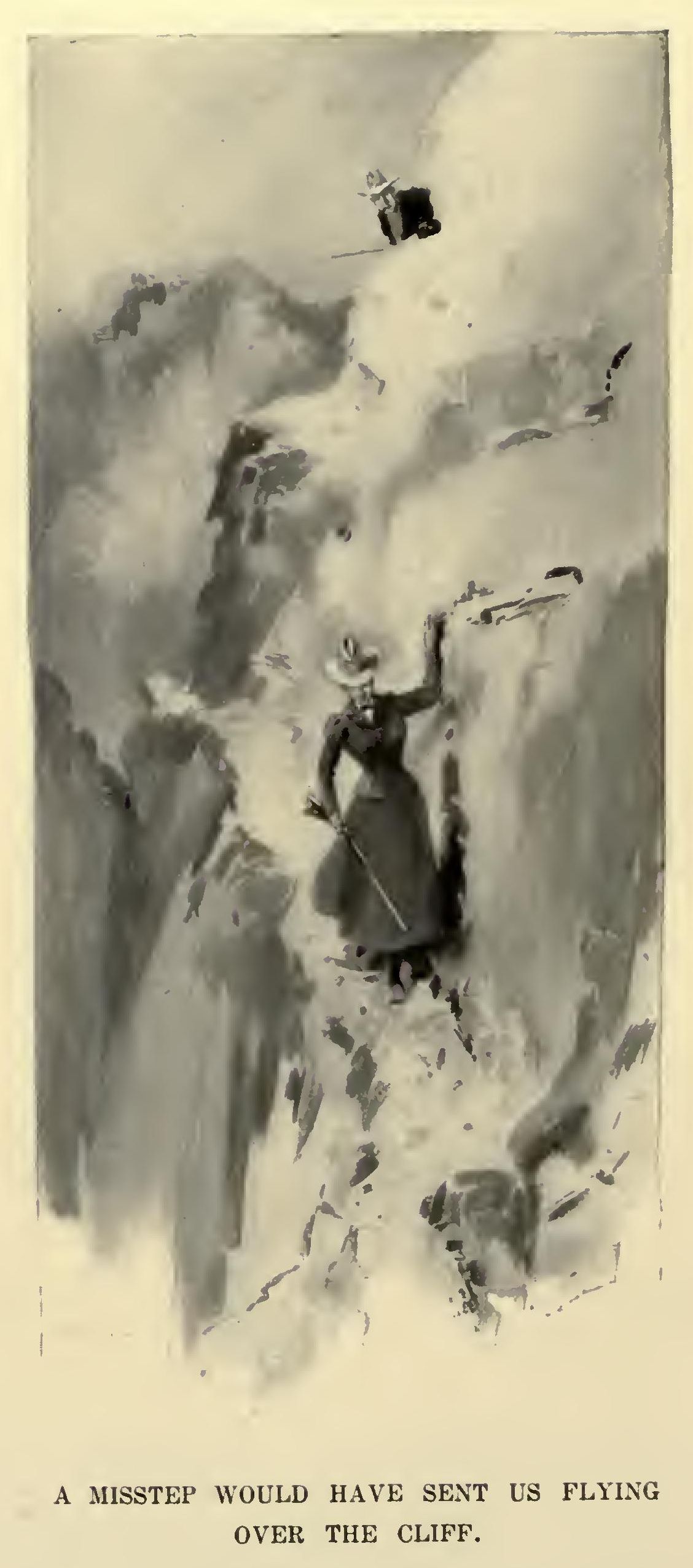 The fearless-footed mountain sheep had crossed this sliding crumbling earth and gravel incline with apparent ease. For us it was go on or go back. There was no middle course. The row of tiny hoof marks running straight across from one safe bank to the other deceived us. It could not be so very difficult. We dismounted; Nimrod threw the bridle over his horse's head and started across, leading his beast. The animal snorted as he felt the foot-hold giving way beneath him, but Nimrod pulled him along. It was impossible to stand still. It would have been as easy for quicksilver to remain at the top of an incline. Amid rattling stones and sliding earth they landed on the firm bank beyond, fully three hundred feet below me.