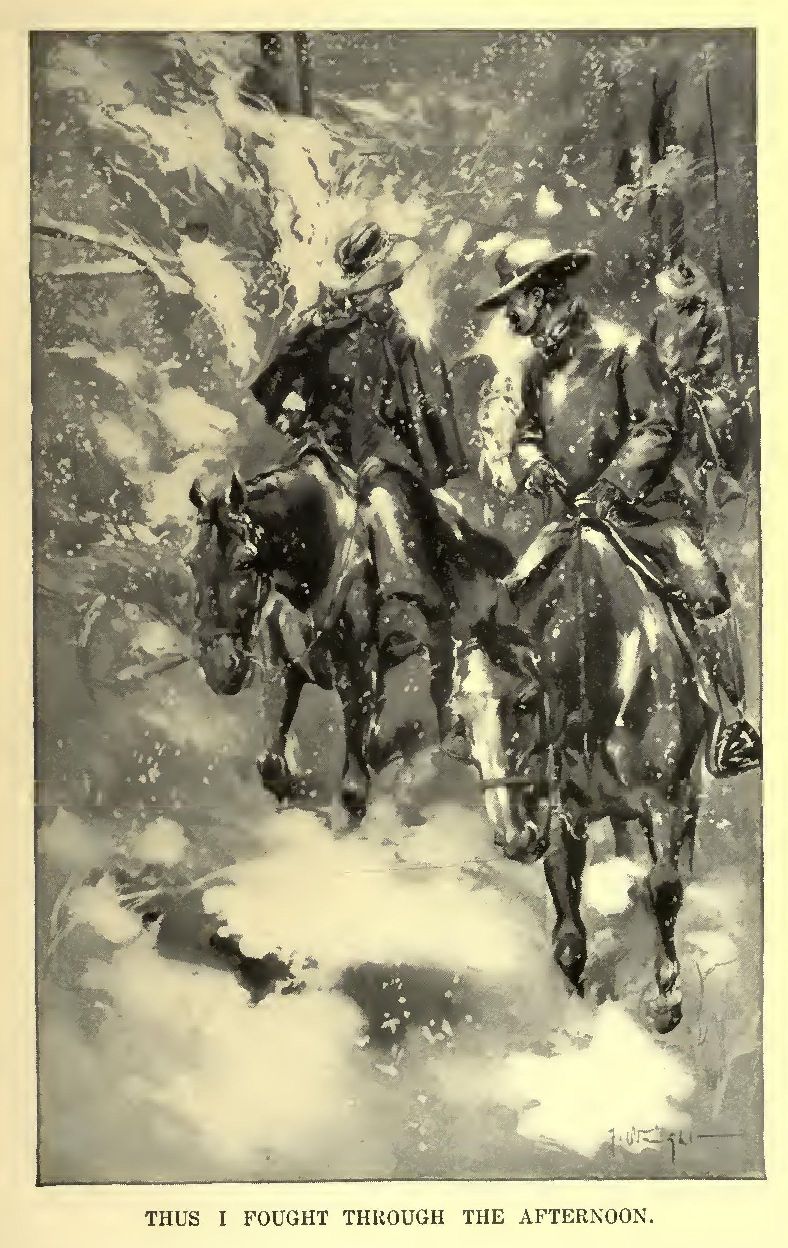 I had barely time to right myself and get out of the way of my horse, which now plunged forward upon the sliding rock with me. The terrified animal lost his head completely. I could not keep away from his hoofs. He would not let me keep in front, I dare not get above for fear I should slip under his feet, or below him for fear he should slide upon me. I lost my balance again while dodging away from him as he plunged and balked, but managed to grab his mane and we both slid a horrible distance. I could hear Nimrod shouting on the bank, but did not seem to understand him. I had the stage, centre front, and it was all I could attend to.