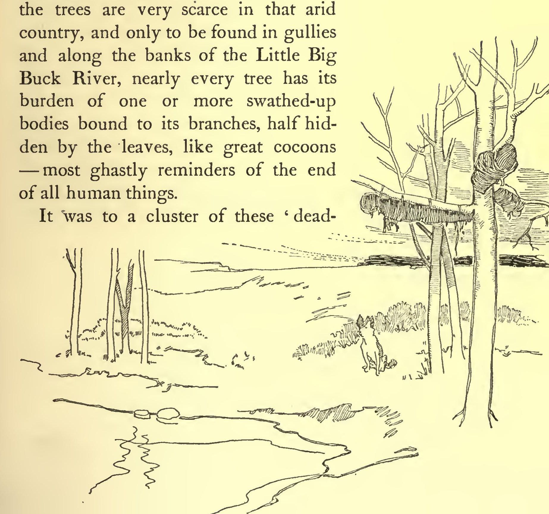 The cowboy meal, which I believe was not elaborated for us, was a healthy solid affair of meat, vegetables, hot biscuit, coffee, and prunes, appetisingly cooked and unstintingly served, for the Bad Land appetite is like unto that of the Rocky Mountains, lusty and big. The saddling of fresh horses made a lively scene for a few moments in the corral; then the men rode off for the afternoon's business of branding.
