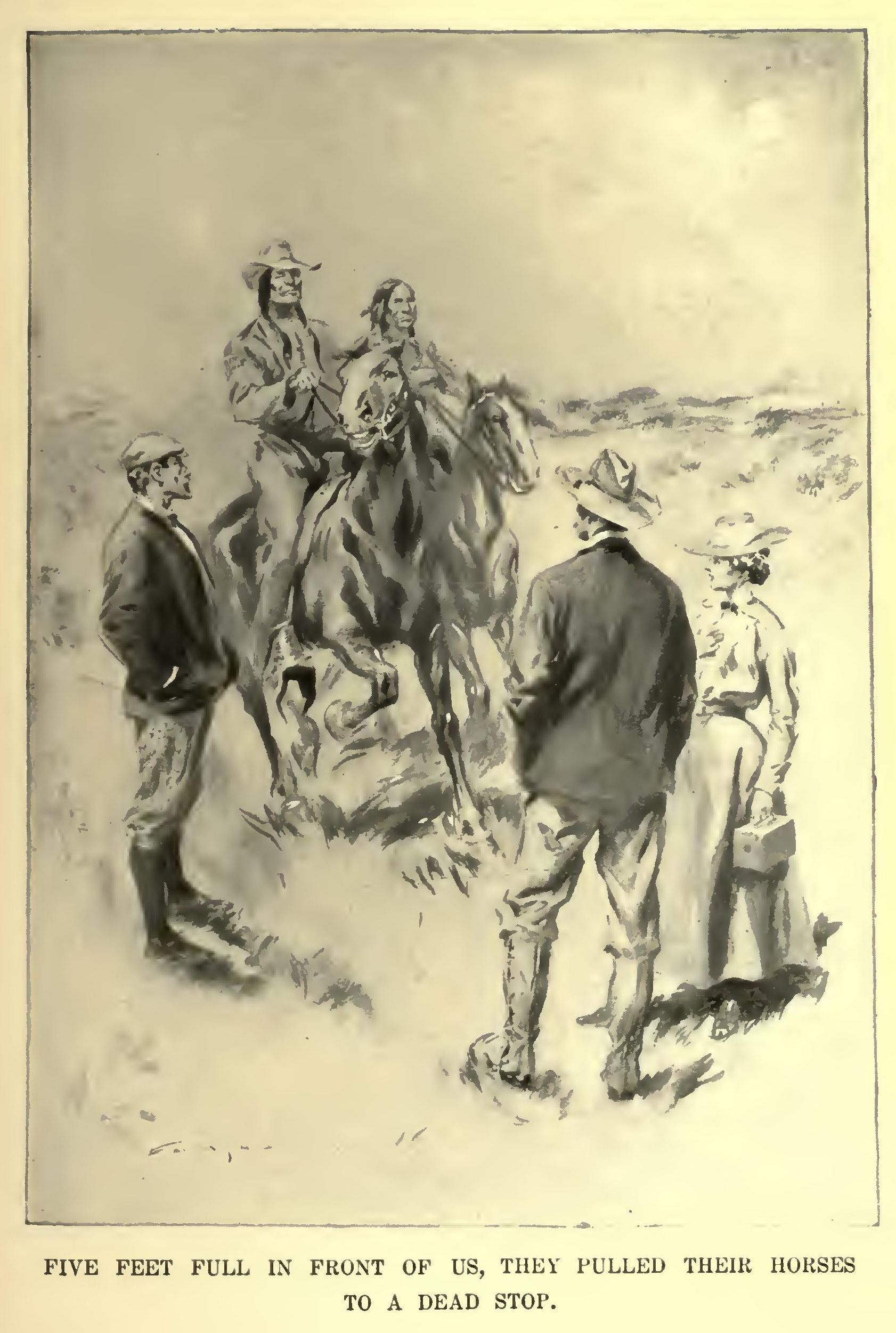 There is also another side. A woman at best is physically handicapped when roughing it with husband or brother. Then why increase that handicap by wearing trailing skirts that catch on every log and bramble, and which demand the services of at least one hand to hold up (fortunately this battle is already won), and by choosing to ride side-saddle, thus making it twice as difficult to mount and dismount by yourself, which in fact compels you to seek the assistance of a log, or stone, or a friendly hand for a lift? Western riding is not Central Park riding, nor is it Rotten Row riding. The cowboy's, or military, seat is much simpler and easier for both man and beast than the Park seat—though, of course, less stylish. That is the glory of it; you can go galloping over the prairie and uplands with never a thought that the trot is more proper, and your course, untrammelled by fenced-in roads, is straight to the setting sun or to yonder butte. And if you want a spice of danger, it is there, sometimes more than you want, in the presence of badger and gopher holes, to step into which while at high speed may mean a broken leg for your horse, perhaps a broken neck for yourself. But to return to the independence of riding astride: