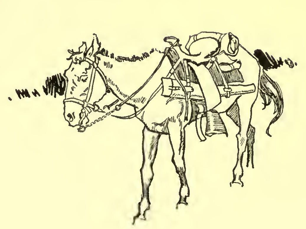 For riding, it is better to carry your own saddle and bridle and to buy a saddle horse upon leaving the railroad. You can look to the guides for all the rest, such as pack saddles, pack animals, etc.
