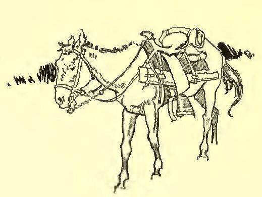 My saddle is a strong but light-weight California model; that is, with pommel and cantle on a Whitman tree. It is fitted with gun-carrying case of the same leather and saddle-bag on the skirt of each side, and has a leather roll at the back strapped on to carry an extra jacket and a slicker. (A rain-coat is most important. I use a small size of the New York mounted policemen's mackintosh, made by Goodyear. It opens front and back and has a protecting cape for the hands.) The saddle has also small pommel bags in which are matches, compass, leather thongs, knife and a whistle (this last in case I get lost), and there are rings and strings in which other bundles such as lunch can be attached while on the march. A horsehair army saddle blanket saves the animal's back. Nimrod's saddle is exactly like mine, only with longer and larger stirrups.
