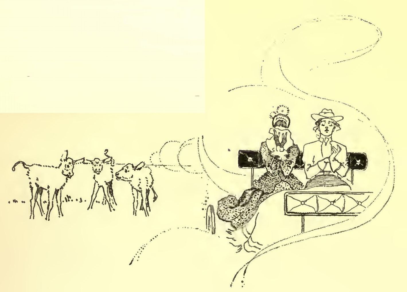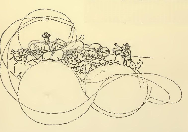 A particularly fractious heifer at this point suddenly changed my contemplation of Van Anden's character into a lively share of Van Anden's job. The creature was making good time straight towards me, and as I had dropped considerably behind the herd in order to breathe some fresh air and to be free from the dust, I knew that it meant a long hard chase for Van and his tired horse if I did not head off that heifer; I felt I owed him that much. I had seen the cowboys do that very thing a hundred times that morning, but you cannot stand on your toe by watching a ballet dancer do it. However, I started on a gallop, slanting diagonally towards the creature, swinging one arm frantically (I really could not let go with both) and yelling "Hi, hi!" I wondered what would happen next, for to be honest, I was exquisitely scared. Why scared? It is not for me to explain a woman's dread of the unknown and untried.