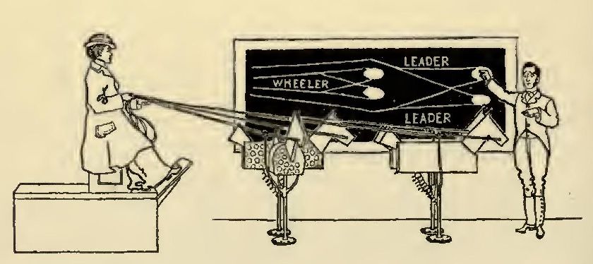 "Grab the lines, can you?" he said, as he seized the whip and put both feet on the brake. The leaders were curveting back on the wheelers in a way which meant imminent mix up, their legs over traces and behind whiffle-trees. On the right, of us was solid rock up, on the left solid rock down, one hundred feet to the stream, and just ahead was the sharp turn the road made to a higher ledge in its zigzag up the mountain. I had always intended to learn to drive four-in-hand, but this first lesson left me no pleasure in the learning. There were no little triumphs of difficulties mastered, no gentle surprises, no long, smooth, broad, and level stretches with plenty of room to pull a rein and see what would happen. I had to spring into the situation with knowledge, as Minerva did into life, full grown. It was no kindergarten way of learning to drive four-in-hand.
