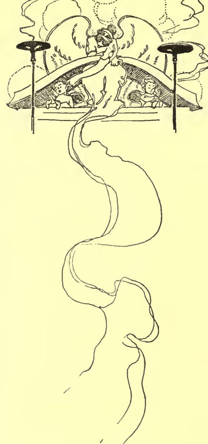 Next morning. She's gone. Ring the bells, boom the cannon! I saw the Japan steamer bear the Sweet Pea Lady rapidly into deep water. At last easeful peace may again dream on my shoulder. When I returned to the hotel the clerk handed me an envelope enclosing a lady's visiting card (kind fate, she lives in Japan) on which was written "In grateful appreciation of your kindness," and with the card were two sprays of Pressed Sweet Peas.