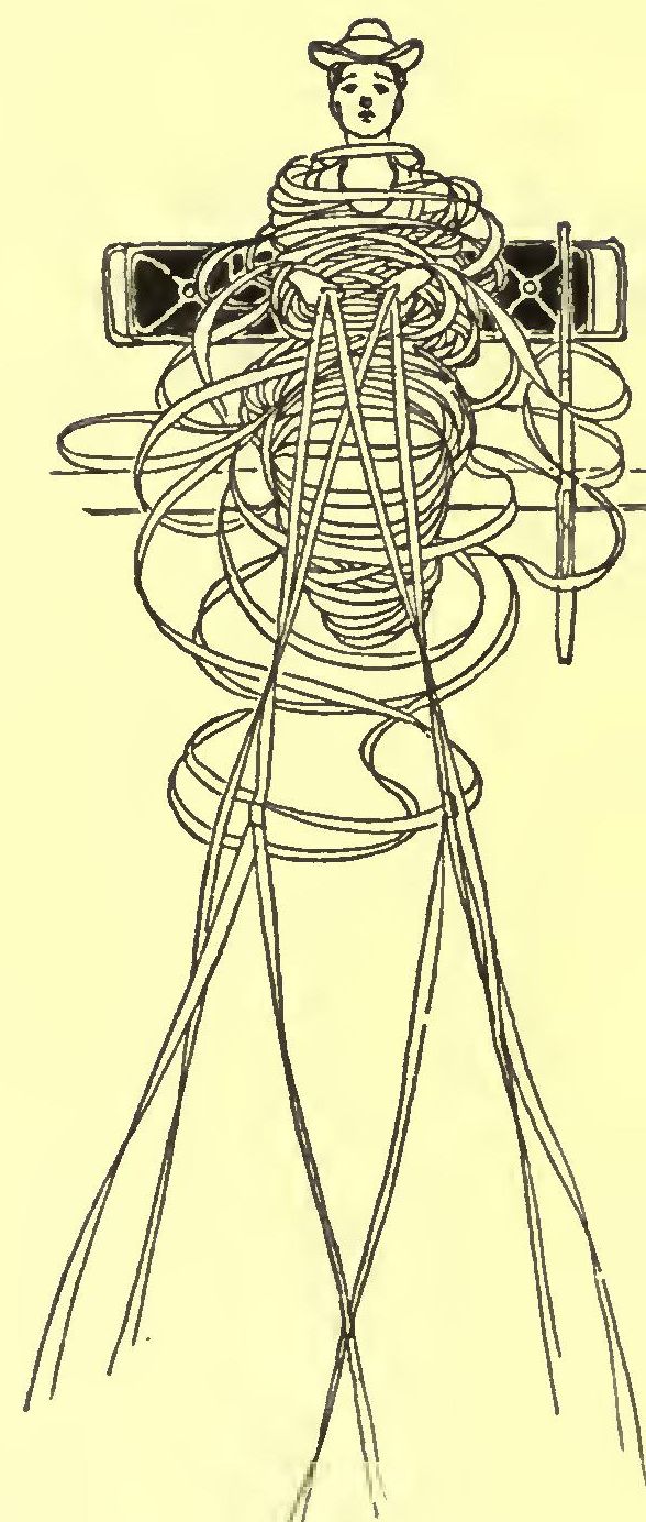 I grabbed the reins in both hands. There were yards of them, rods of them, miles of them—they belonged to a six or sixteen horse set. I do not know which. I sat on them. They writhed in my lap, wrapped around my feet, and around the gun against my knee, in a hopeless and dangerous muddle. Of course the reins were twisted. I did not know one from the other. I gave a desperate jerk which sent the leaders plunging to the right, where fortunately they brought up against the rock wall. Had they gone the other way nothing but our destiny could have saved us from going over the edge. Crack went the whip in the right place.