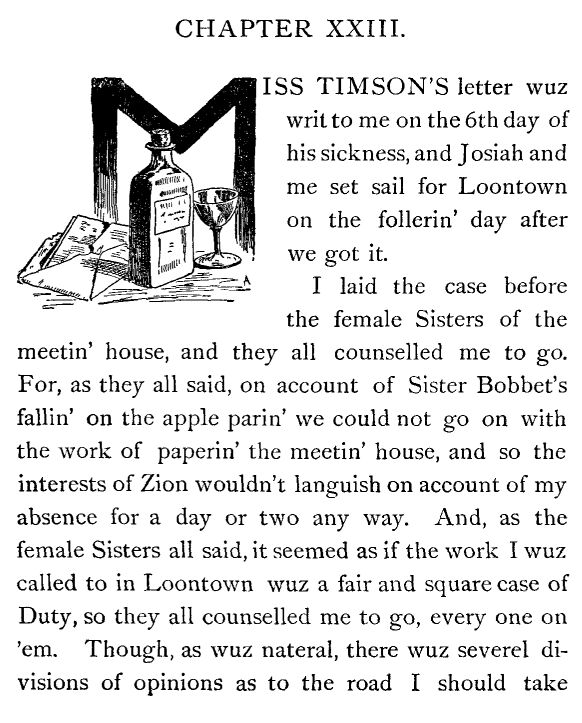 I laid the case before the female Sisters of the meetin' house, and they all counselled me to go. For, as they all said, on account of Sister Bobbet's fallin' on the apple parin' we could not go on with the work of paperin' the meetin' house, and so the interests of Zion wouldn't languish on account of my absence for a day or two any way. And, as the female Sisters all said, it seemed as if the work I wuz called to in Loontown wuz a fair and square case of Duty, so they all counselled me to go, every one on 'em. Though, as wuz nateral, there wuz severel divisions of opinions as to the road I should take a-goin' there, what day I should come back, what remiedies wuz best for me to recommend when I got there, what dress I should wear, and whether I should wear a hankerchif pin or not—or a bib apron, or a plain banded one, etc., etc., etc., etc.